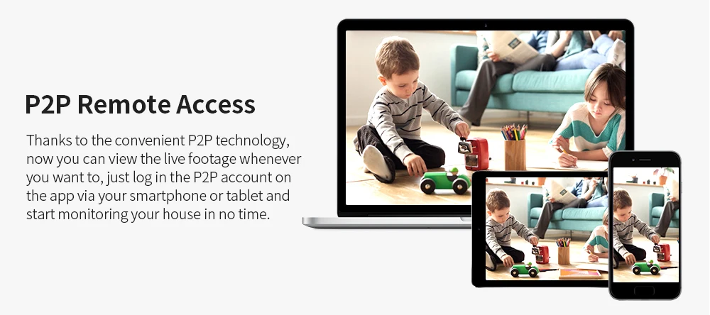 Благодаря удобной Технологии P2P, теперь вы можете просматривать видео в реальном времени, когда захотите, просто Войдите в учетную запись P2P в приложении через ваш смартфон или планшет и начните следить за своим домом в кратчайшие сроки.