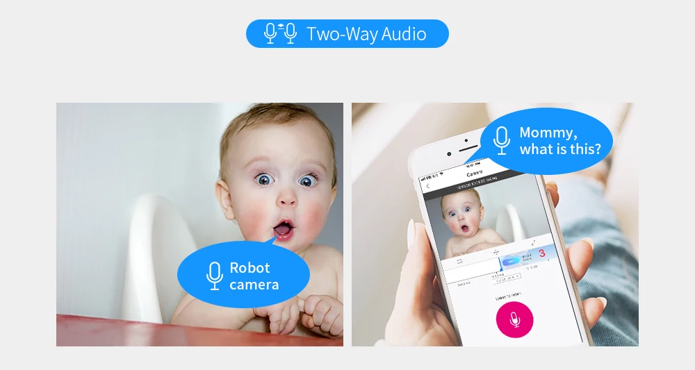 Когда видео наблюдения не могут удовлетворить вас, мы предоставляем вам двустороннее аудио в режиме реального времени. Камера оснащена микрофоном и динамиком. Так что вы можете говорить со своими детьми через смартфон удаленно, когда захотите.