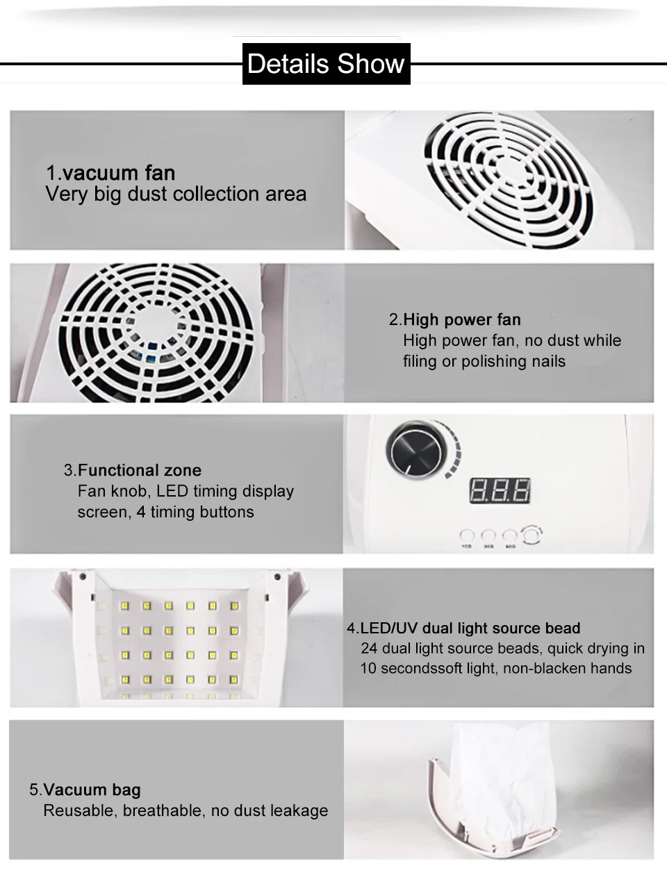 Размер коробки: 30,5*19,5*13,5 см Номер модели: 858-9A Мощность: 80 Вт продукция G.W: 1500 г Сертификат: CE Страна происхождения: Гуанчжоу, Китай Цвет: белый Номинальный Вход: 100-240 В Функция: Профессиональный сбор пыли и сушка ногтей Особенности: Двойные вентиляторы Сильное всасывание Два мешка для пыли Zero Шум Не содержит вредных Не чернеют