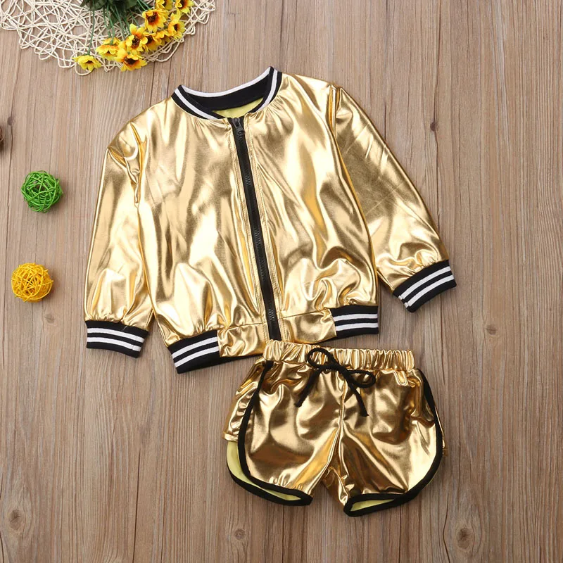 Осенний комплект для маленьких девочек: блестящая золотистая куртка + шорты!