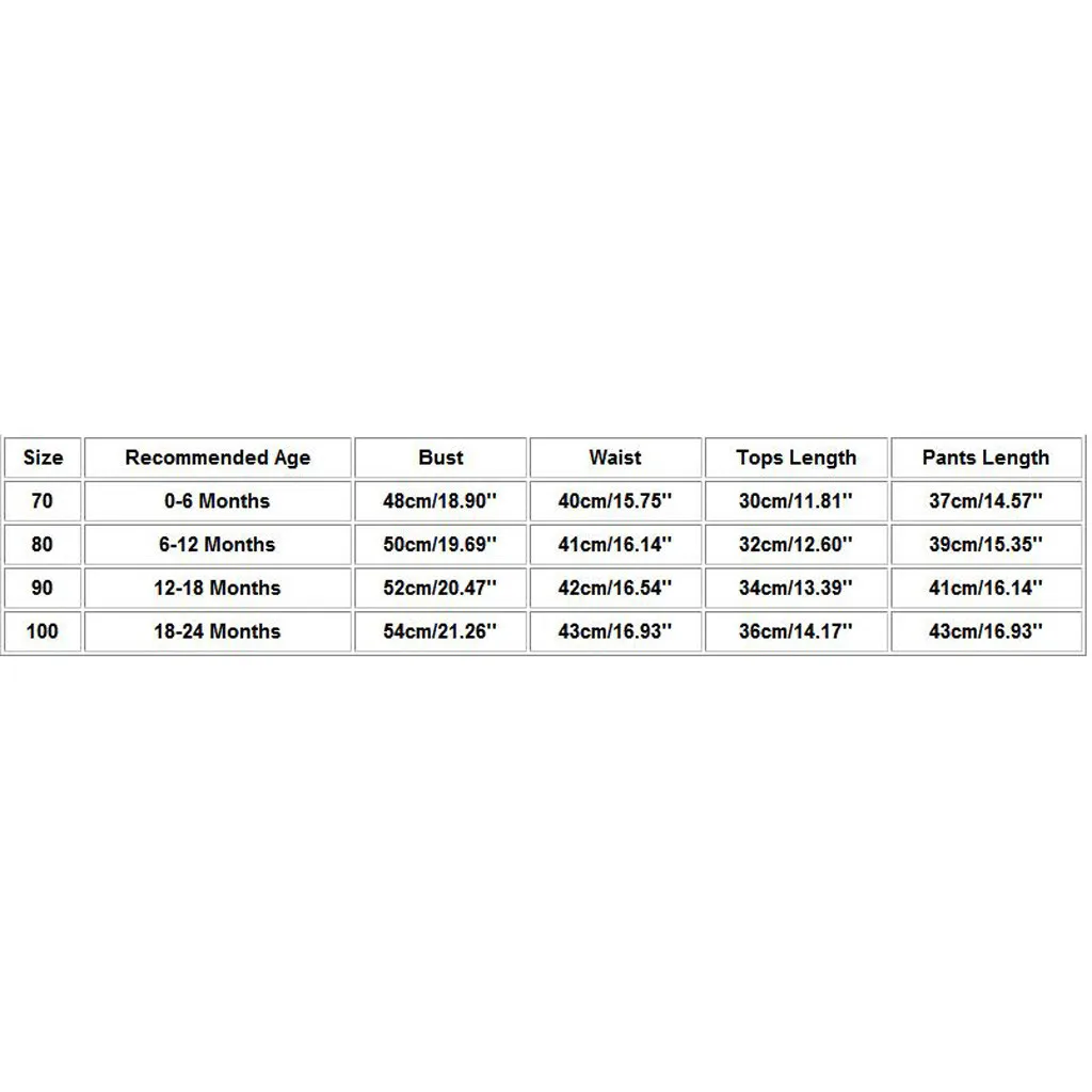 Размер Рекомендуемый возраст Обхват груди Обхват талии Топы Длина Брюки Длина 70 Для детей от 0 до 6 месяцев 48 см/18,90'' 40 см/15,75'' 30 см/11,81'' 37 см/14,57'' 80 6-12 месяцев 50 см/19,69'' 41 см/16,14'' 32 см/12,60'' 39 см/15,35'' 90 12-18 месяцев 52 см/20,47'' 42 см/16,54'' 34 см/13,39'' 41 см/16,14'' 100 18-24 месяцев 54 см/21,26'' 43 см для ухода за ребенком для мам/16,93'' 36 см/14,17'' 43 см для ухода за ребенком для мам/16,93''