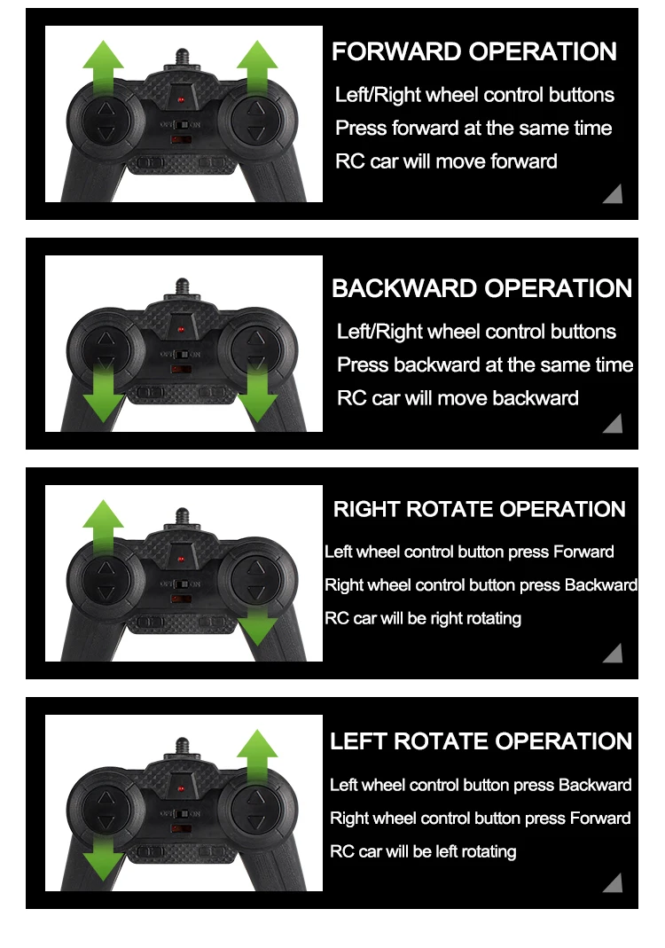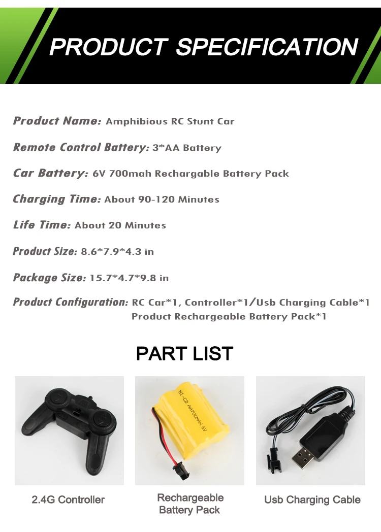 Частота: 2,4 ГГц Канал: 4CH Выходное напряжение: 6 В постоянного тока Аккумулятор: 6 В 700 мАч Li-battery (входит в комплект) Батарея RC: 2x1,5 V AA (не входит в комплект) Расстояние управления: около 40 м Время зарядки: прибл. 60 минут Время звучания: около 10 ~ 15 минут Подходящий возраст: 14 + Материал: АБС-пластик Цвет: зеленый, оранжевый Полная функция управления по радио Вперед, назад, стоп, поворот влево и вправо Размер изделия: прибл. 22,5*20,5*10,8 см