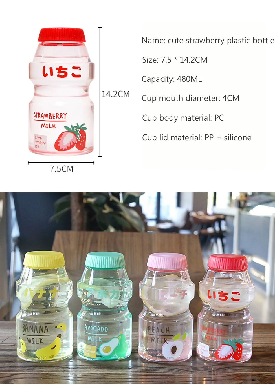 Материал корпуса чашки: поликарбонат Материал крышки чашки: ПП + силикон Цвет: красная клубника, розовый персик, желтый банан, зеленый авокадо Емкость: 480 мл Размер: около 7,5*14,2 см