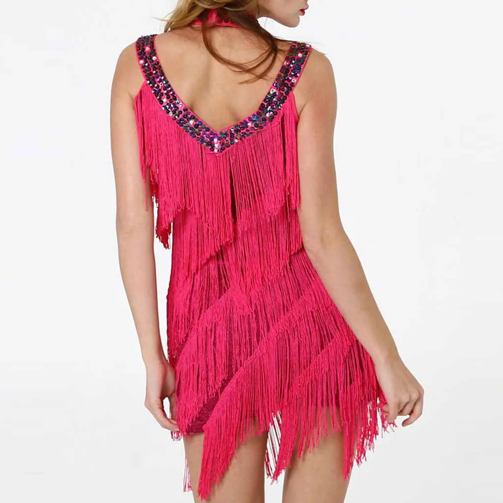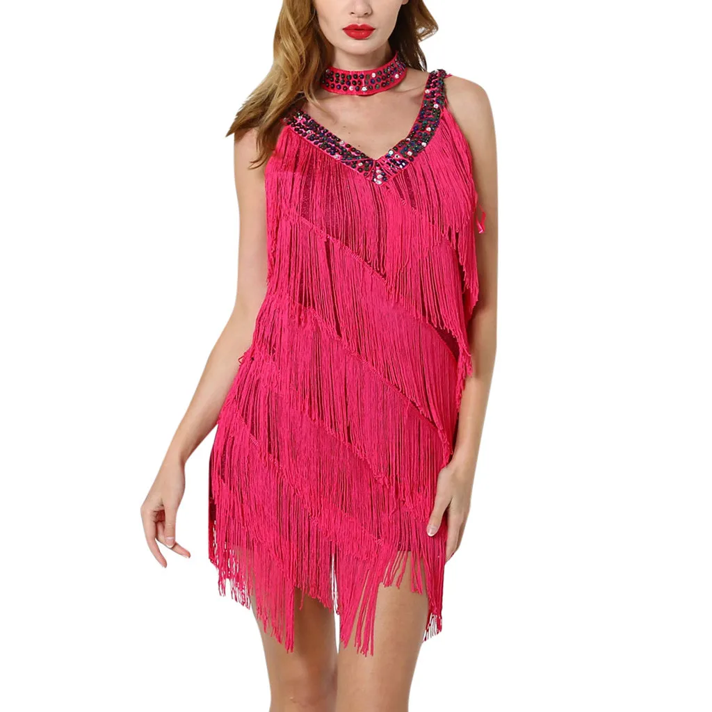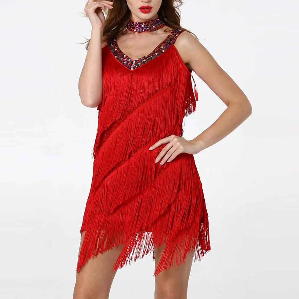 Женское платье для латинских танцев с глубоким v-образным вырезом, блестками и бахромой