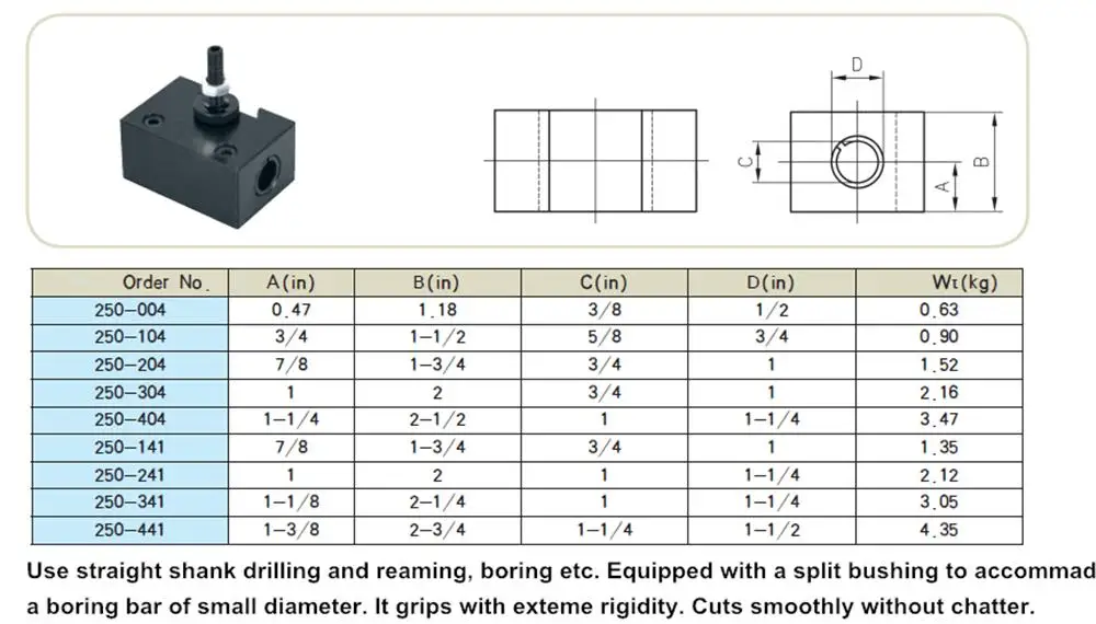 -Расточные стержни и инструменты с круглым хвостовиком 250-002 в, а также квадратные сверла для торцевой поверхности станка, внешней, режущей, буровой и т. Д.- 250-004 с прямым хвостовиком для сверления и перемотки, скучный и т. д. Оснащен разъемной втулкой для accommadate расточной штанги малого диаметра.