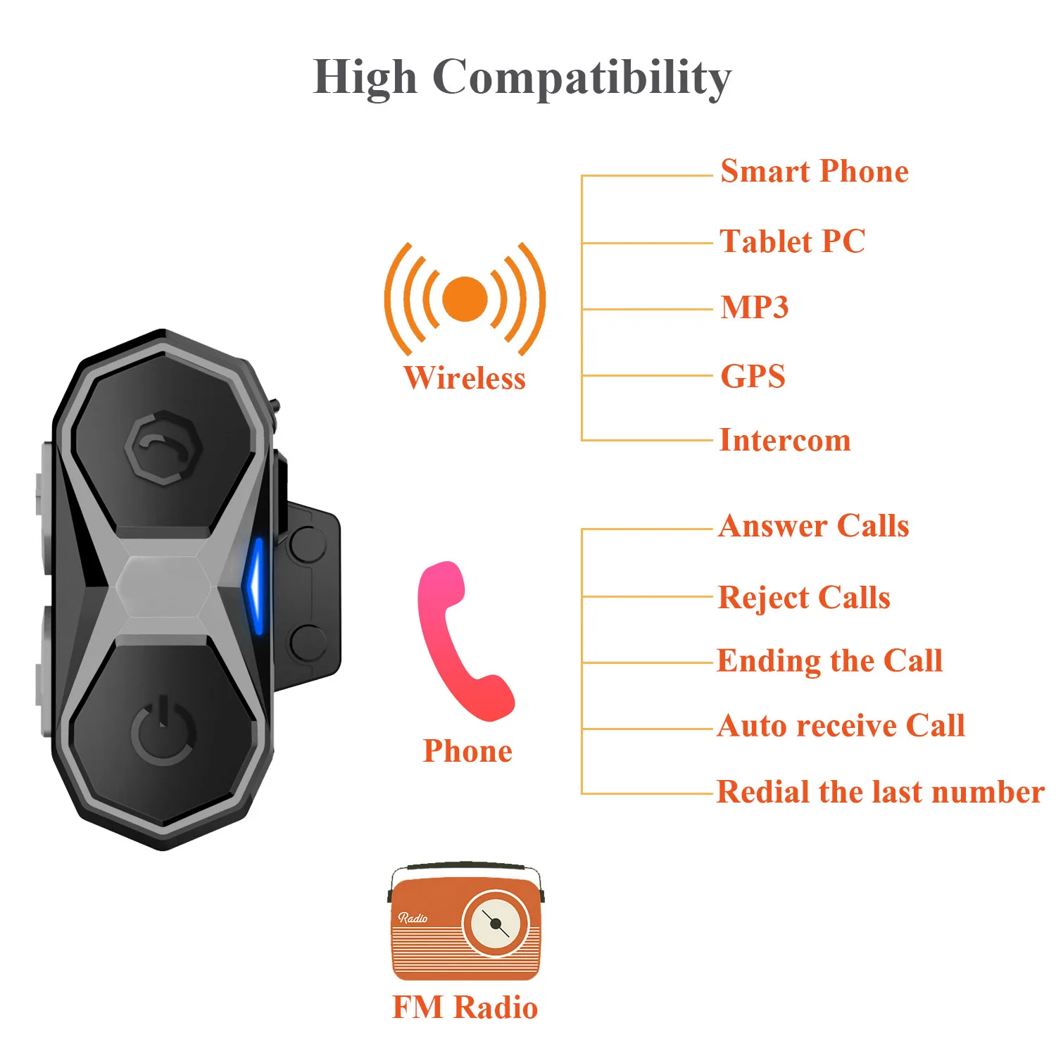 WT005-это гарнитура BT для шлема, предназначенная для мотоциклистов и пассажиров, которые хотят иметь четкие и надежные беспроводные связи во время езды. Этот Интерком совместим с сотовыми телефонами BT и может быть подходит для любого типа шлема для мотоциклистов. Он может удовлетворить все виды потребностей, такие как беспроводной набор номера, прием звонков, прослушивание музыки в формате MP3, получение голосовой подсказки GPS.