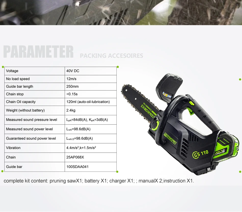 Мотор: бесщеточный мотор Цепь Oregon и руководство лезвие SDS дизайн (без инструмента натяжения цепи) Длина цепи: 10" Oiltank:120 мл Максимальный диаметр резки: 260 мм Время работы: около 30 мин (4.0Ah) Напряжение 40V DC Без скорости нагрузки 12 м/с Длина направляющего стержня 250 мм Цепь остановка <0,15 s Емкость цепного масла 120 мл (автоматическая смазка) Вес (без батареи) 2,4 Кг Измеренный уровень звукового давления LpA = 84 дБ (A), кПа = 3 дБ (A) Измеренный уровень звуковой мощности LwA = 98,6 дБ (A) Гарантированный уровень звуковой мощности Lw A.D = 98,6 дБ (A) Вибрация 4,4 m/s2,k = 1,5 m/s2 Цепь 25AP068X Направляющая планка 100SDAA041