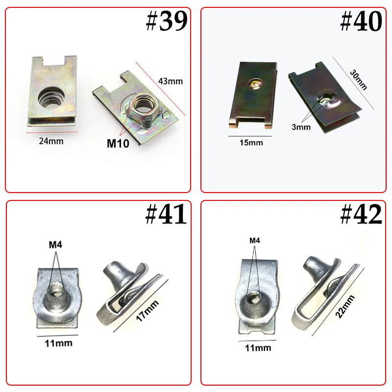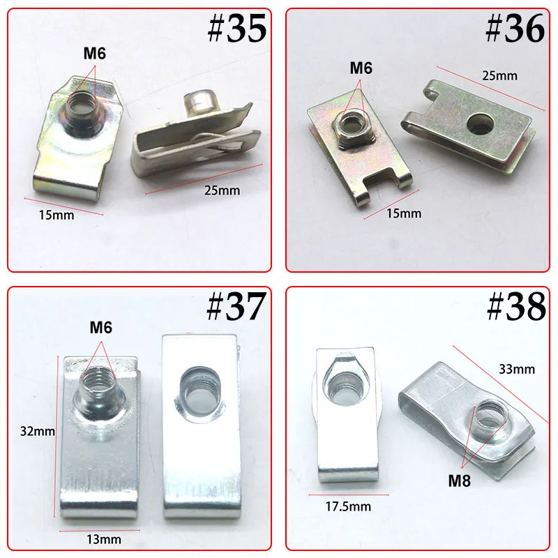 Описание товара: Высококачественные автомобильные аксессуары, обычно используются для установки боковых юбок, бампера и другой отделки. Идеально подходит для крепления или фиксации проводов и кабелей на автомобильной двери или приборной панели. Широко используется для автомобильного крыла, бампера, двери, боковой юбки или другой поверхности кузова автомобиля. Идеально подходит для замены изношенных, поврежденных или сломанных зажимов, легко устанавливается. U-гайка-это застежка, состоящая из двух лоскутов в форме зажима с двумя внешними приподнятыми формами резьбы. Конструкция этой гайки означает, что При затягивании прилагается двойная эластичная сила. Эту гайку можно держать на месте вручную При затягивании. Для крепления u-образных гаек не требуется никаких специальных инструментов, и их можно собрать гораздо быстрее и легко, чем обычные гайки. Функция самофиксации означает, что можно избежать дорогостоящих операций, таких как нарезание резьбы, сварка или заклепка. Его также можно использовать с хрупкими материалами, такими как стекло, пластик или эмалированные поверхности. В этих случаях устойчивость гайки позволяет избежать трещин или повреждения области нанесения. Эта гайка фиксируется с затягивающимися torques гораздо ниже, чем для стандартных гаек из-за своей большой эластичности. Он обычно устанавливается на кромке панели, но также может использоваться в прямоугольном монтажном отверстии в середине панели. U-гайки обеспечивают прочную и надежную фиксацию для приложений, где две или более панелей требуют удержания вместе. Типичные приложения включают в себя автомобили, бытовые приборы, электрическое оборудование и оборудование. Используется для отделки дверей, накладок крыши, внутренних дверных панелей, панелей приборов и т. д.