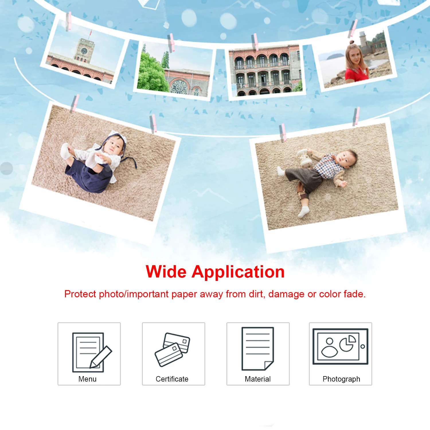 100 листов ламинирующей пленки, защищает фото/важную бумагу от грязи, повреждений или цвета выцветания.