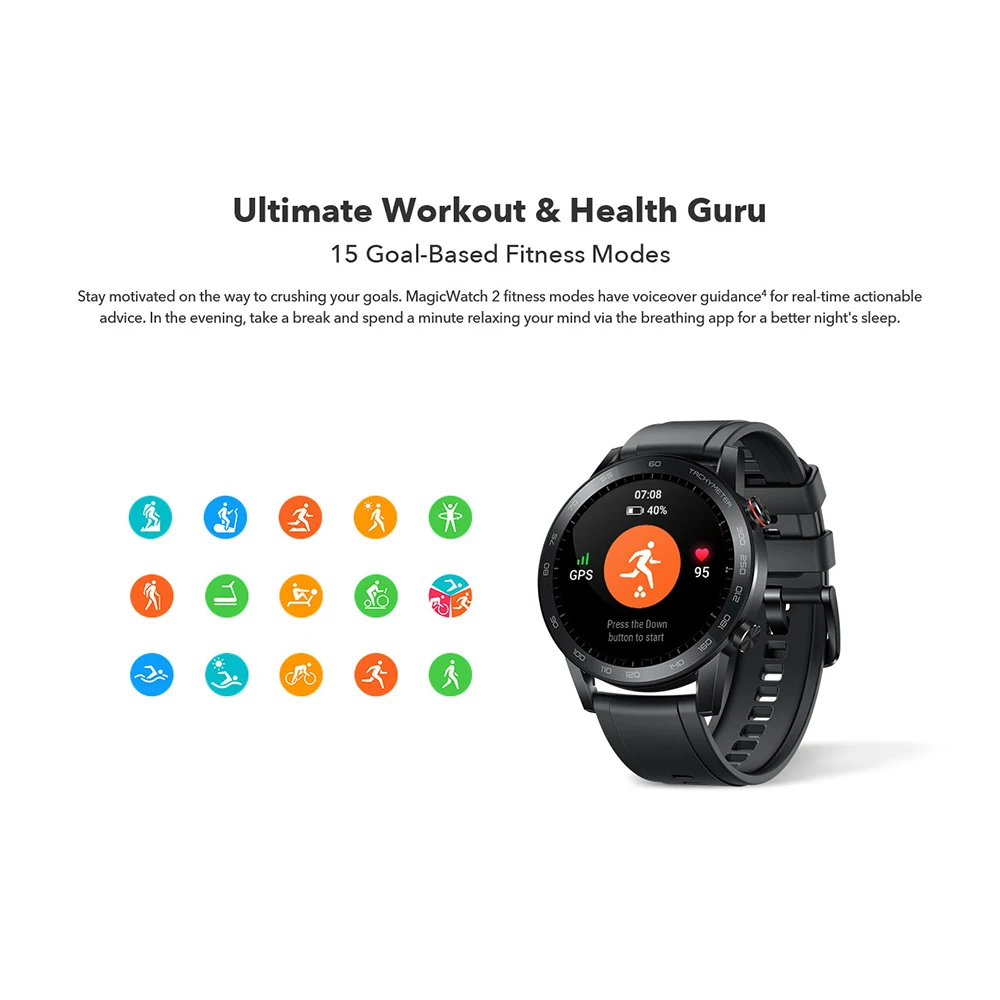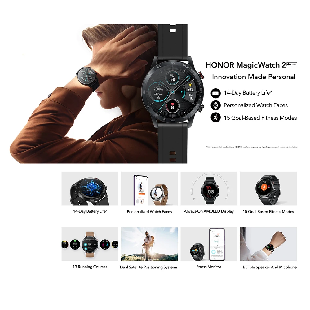 HONOR MagicWatch 2 (MNS-B19) (далее-«Часы»)-ультратонкие спортивные часы с водонепроницаемостью 50 м, более двух недель непрерывной работы от батареи и интегрированные смарт-функции, такие как BT звонки, воспроизведение музыки, научный мониторинг сна/фитнеса/пульса, помощник по информации, gps-отслеживание, И многое другое. Его светильник, модный дизайн, устойчивость к царапинам, научное руководство по фитнесу и точный мониторинг здоровья делают его идеальным часом для повседневного и профессионального ношения упражнений для требовательных потребителей и технических поклонников.