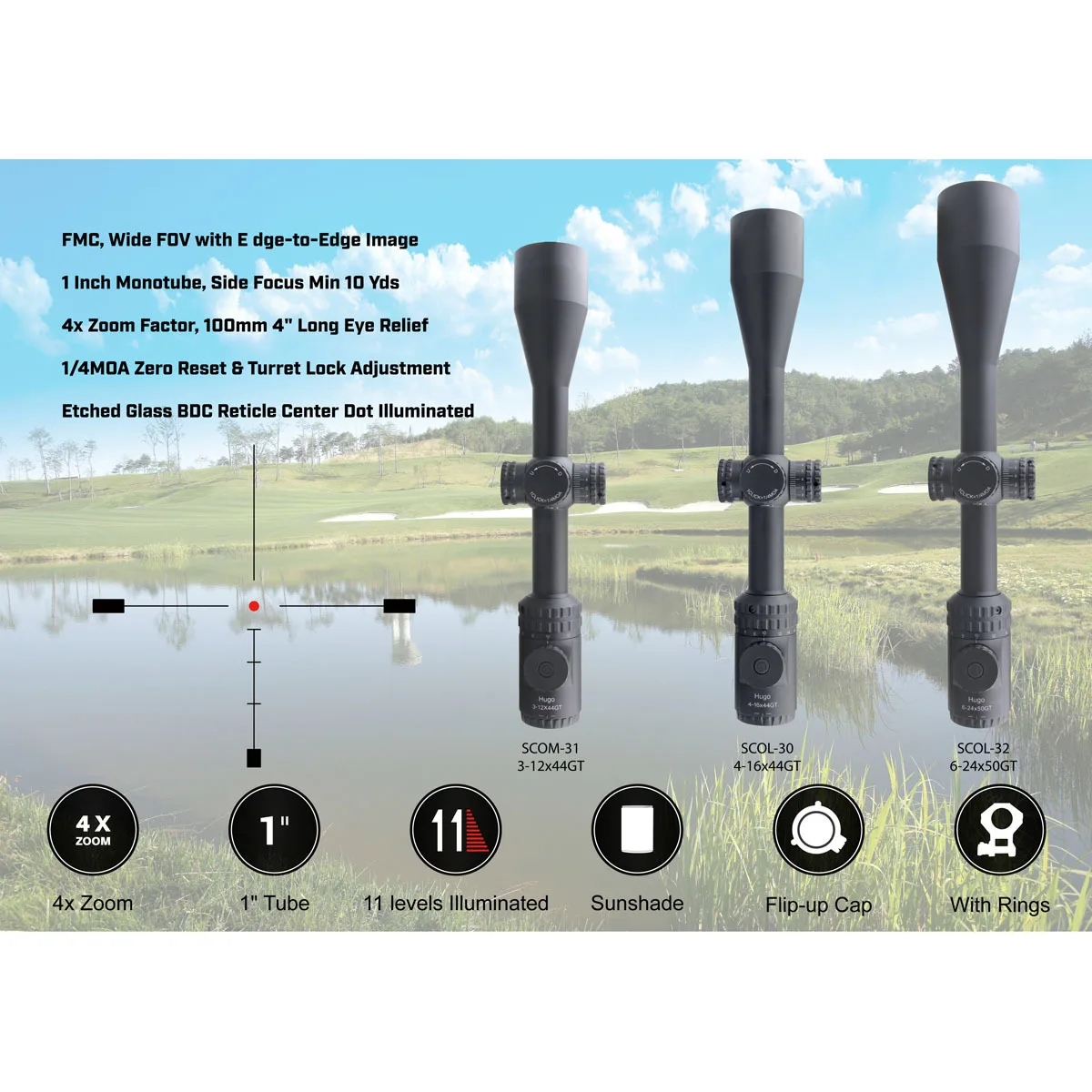 МодельSCOL-30 HugoУвеличение4-16xДиаметр объектива.44 ммДиаметр окулярного объектива.38 мм (1,5 дюйма)Длина глазного объектива60 мм (2,4 дюйма)Выходной ученик11,0-2,7 ммОптическое покрытиеПолностью Мульти пальтоПоле зрения21,1-5,3 футов @ 100 ярдовРельеф глаз105-100 мм (4,1-3,9 дюйма)Длина340 мм (13,4 дюйма)Вес650 г (23,0 унции)Диаметр трубки.25,4 мм 1 "монотрубаНажмите значение1/4 МОАДиапазон высоты50MOAДиапазон ветра50MOAУстановка параллакса10 ярдов до бесконечностиСеткаVOI-10BDC,Освещение11 уровней красный + 1 уровень NVТип батареиCr2032Набор для использования сетки BDC мощностью 10x, большая игра, винтовки Rimfire 22LR и varmint, максимальный диапазон до 600 ярдов