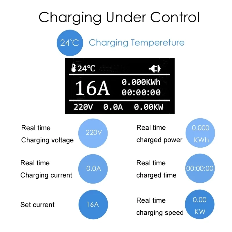 Пуговица круглой формы «А» предназначена для регулировки тока. Слегка коснитесь кнопки, чтобы изменить ток. Когда вы регулируете ток, штепсельная Вилка питания должна быть всегда подключена, штепсельная вилка type1 (SAE J1772) должна быть отключена. Когда вы достигнете нужного тока, подключите его и начните зарядку.