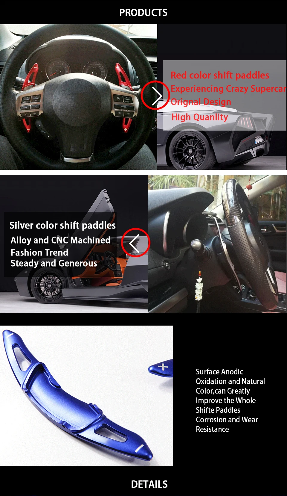 Это список для 2 частей алюминиевого сплава сдвига колеса DSG paddle shifter extension. Уникальный спортивный стиль сдвига весло для выравнивания стиля вашего автомобиля. Изготовлен из высококачественного алюминия, гладкая отделка, идеальное ощущение обработки. Это отличное расширенное модифицированное устройство для вашего любимого автомобиля.