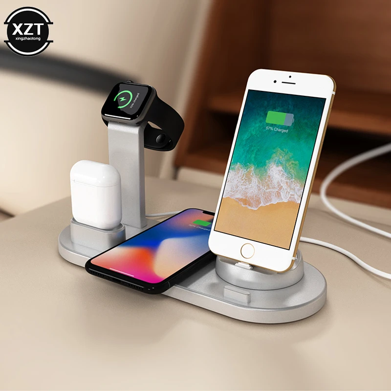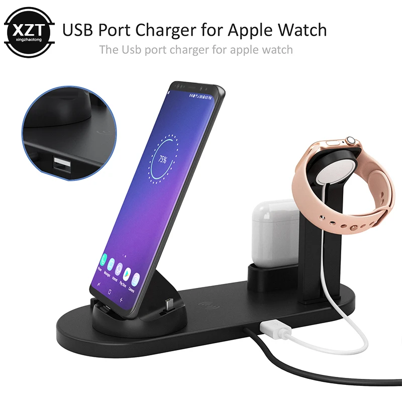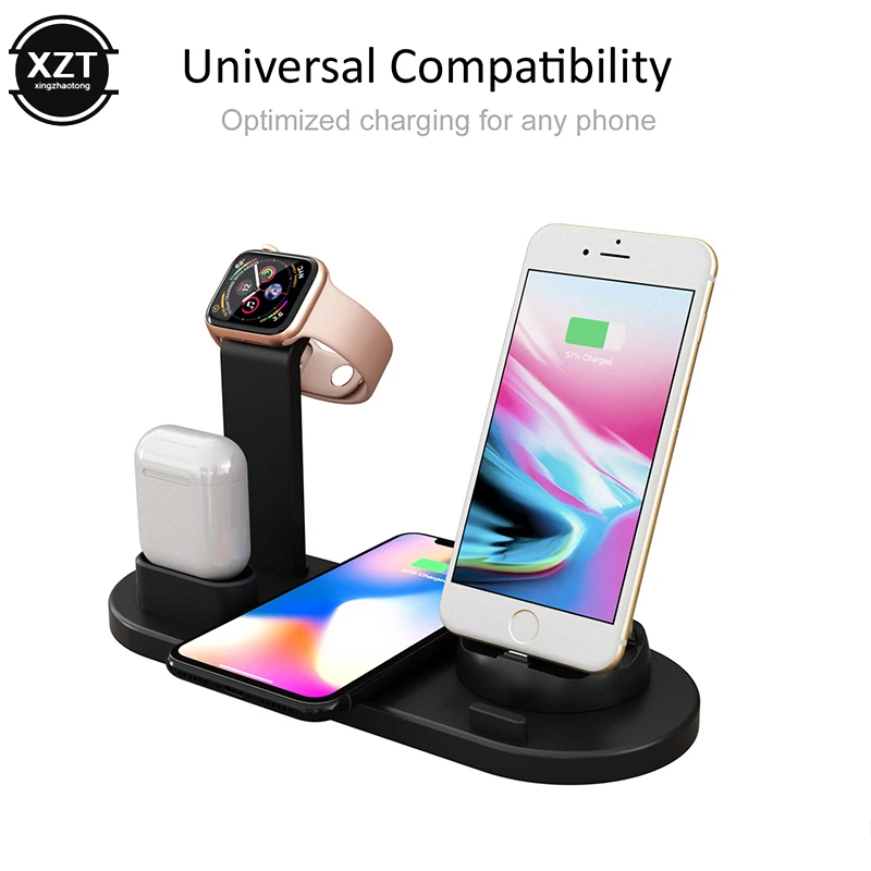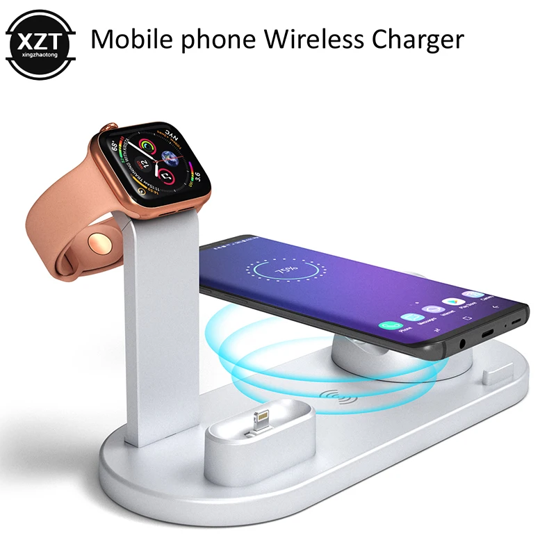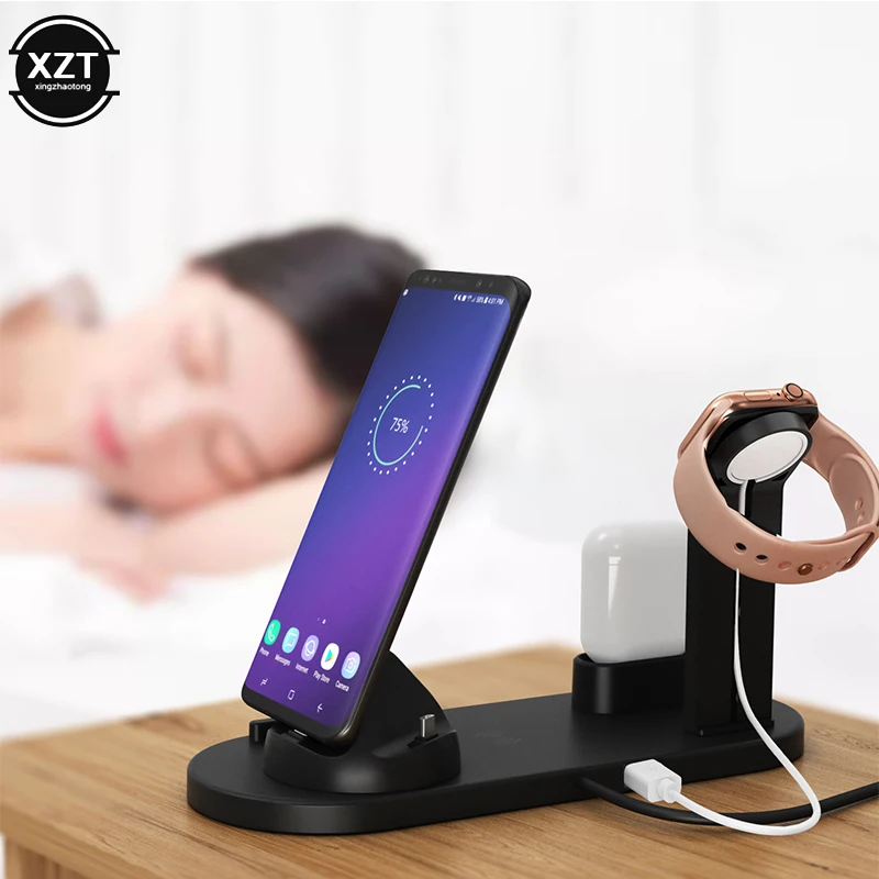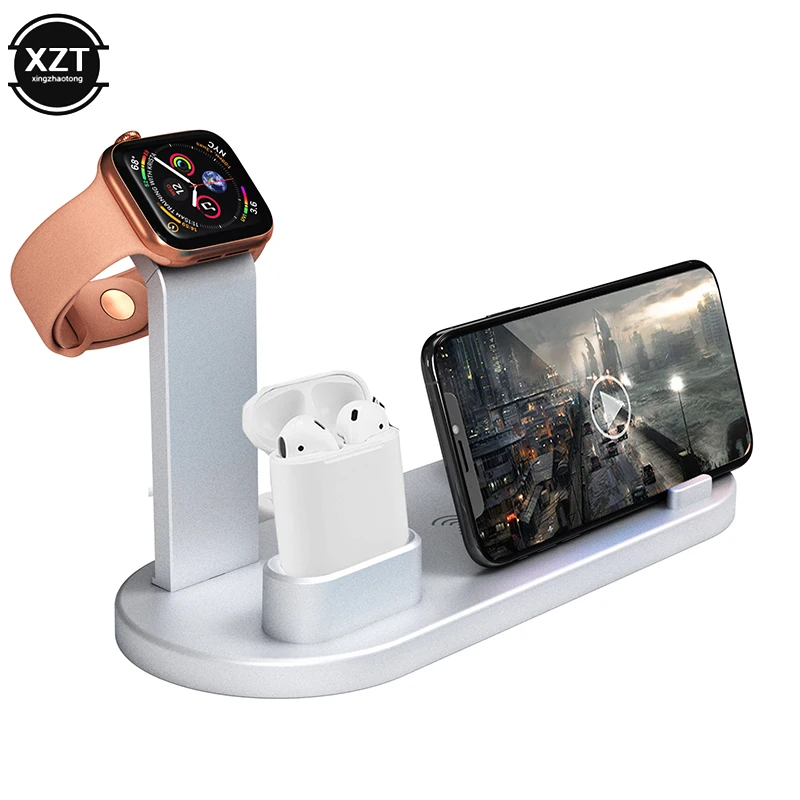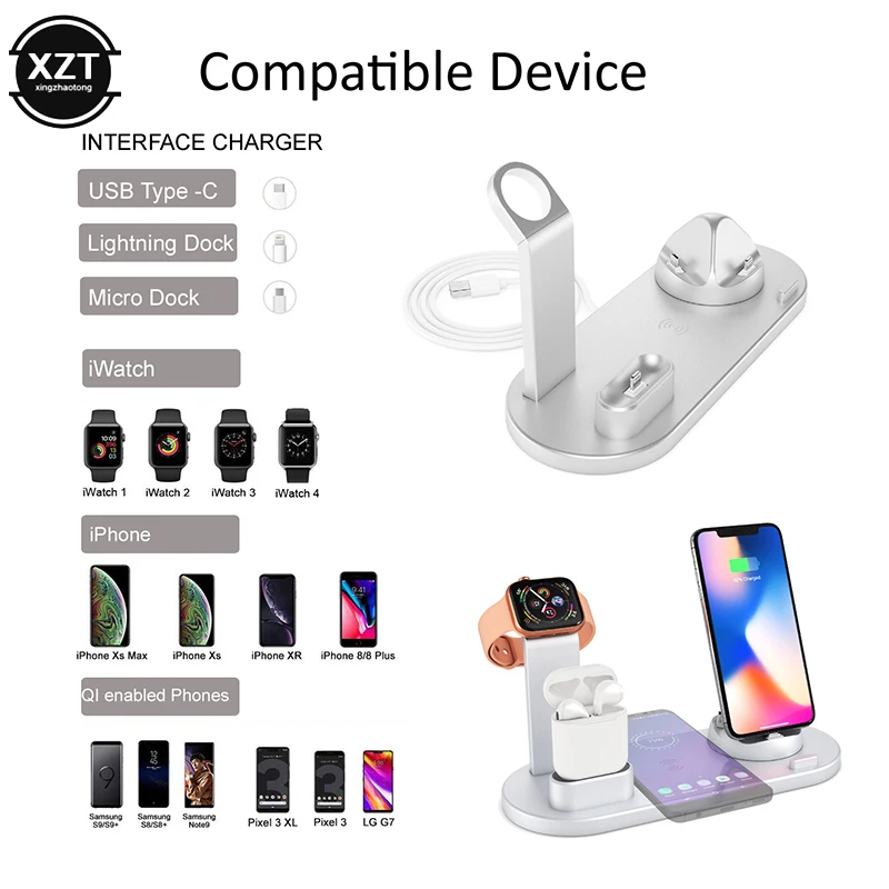 Описание: Беспроводное зарядное устройство 4 в 1, многофункциональная Подставка для зарядки с интерфейсами iPhone/Micro/Type-C может заряжать почти все мобильные устройства, такие как iPhone, iPad, Samsung, LG, зарядная док-станция HTC, Huawei, Sony может свободно вращаться на 360 градусов. Универсальная Совместимость с Apple Watch series 4/3/2/1, airpods и iPhone Xs / Xs Max / Xr / X / 8/8 Plus, Samsung Galaxy S10 / S10 Plus / S10E / S9 / S9 Plus / S8 / S8 Plus / S7 / S7 Edge / S6 edge Plus / Note 10 / Note 9 / Note 8. Зарядная станция использует самые современные технологии автоматического управления. Встроенные гарантии от перезарядки, перегрузки по току и перенапряжения, контроля температуры, обнаружения инородных предметов. Защищает ваше устройство от повреждения от перезарядки. [Лучшее качество] инновационный силиконовый материал, без царапин, для iphone/iwatch/airpods, блокирующий экран или края. Идеально украшает вашу спальню, кабинет, зал, офисный стол. [Простая установка] Просто установите оригинальный кабель apple в подставку, затем он может работать в качестве зарядного устройства для вас. Скройте длинные резервные кабели, сделайте свой стол или ночную тумбочку аккуратной и изящной. Примечание: в комплект не входит Магнитный зарядный кабель для часов Характеристики продукта: Вход: DC5V-3A, 9 В-1,8 А Выход зарядного устройства: DC 5V-1.5 A Беспроводной зарядное устройство мощность на выходе: 10 Вт/7,5 Вт/5 Вт Длина кабеля USB: 1,2 м Посылка включает в себя: Беспроводное зарядное устройство-1 шт. 1 x USB кабель 1 x Руководство пользователя