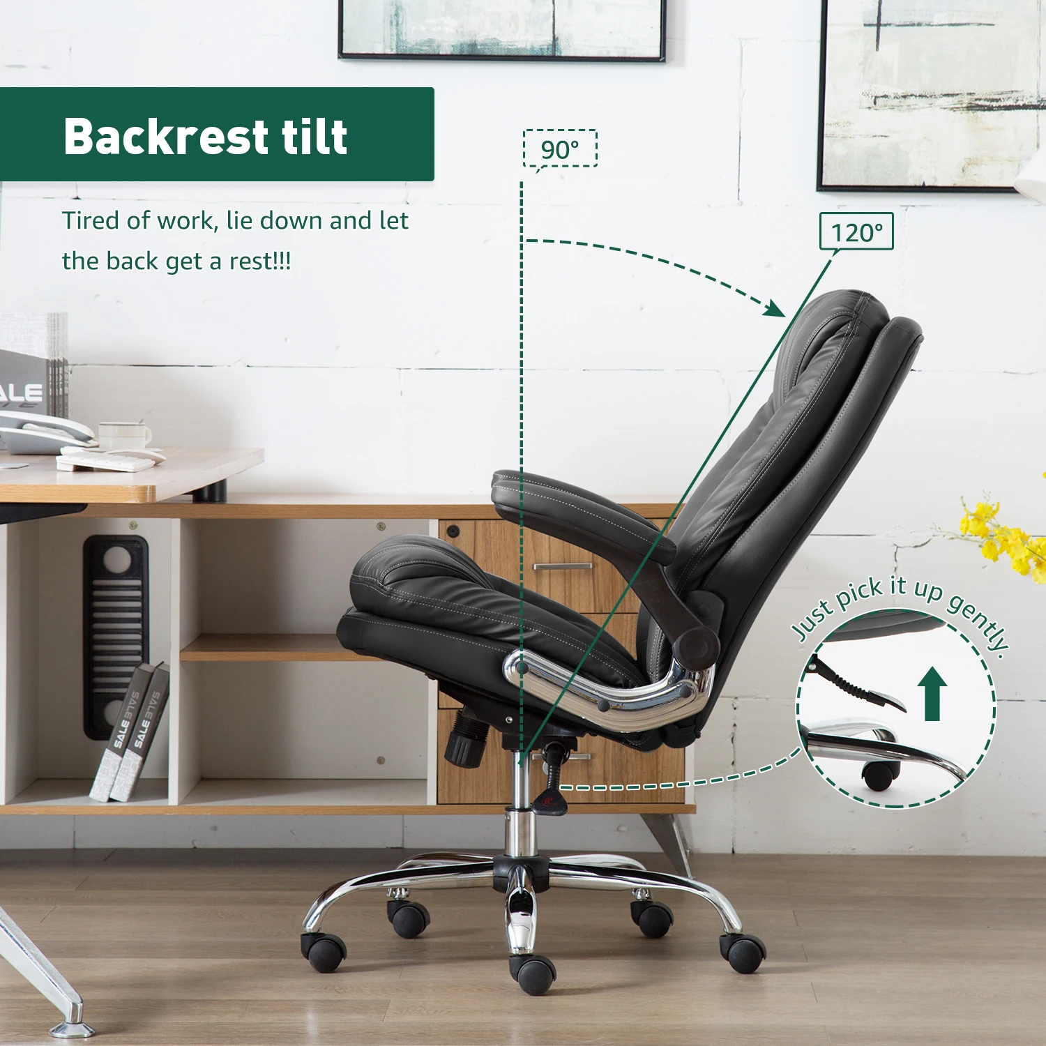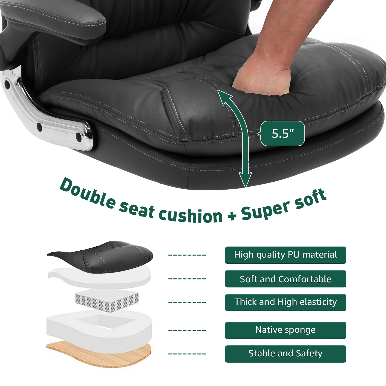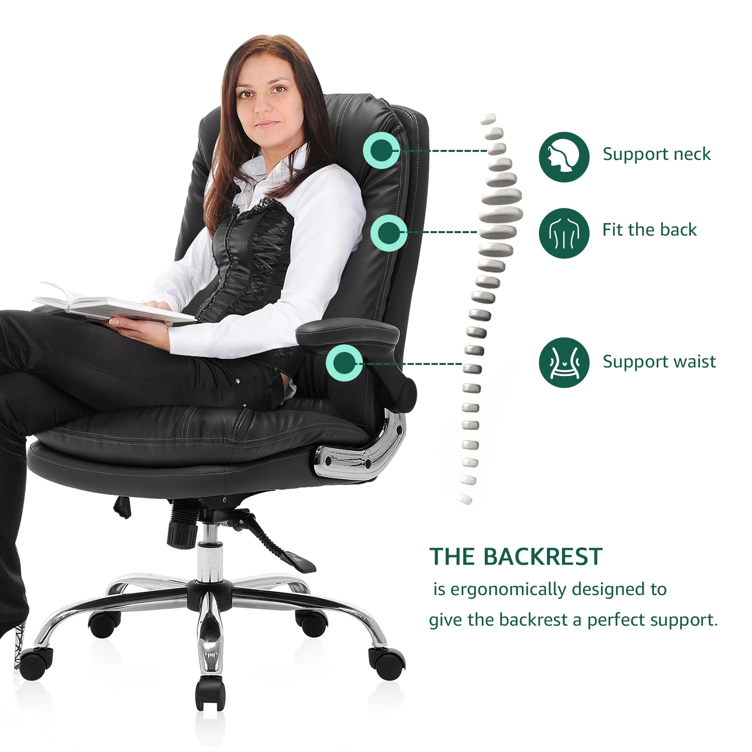 Основная особенность1. Максимальный вес подшипника: 150 кг2. Прочный материал-офисное кресло руководителя изготовлено из высококачественной и экологически чистой искусственной кожи, мягкая, прочная, водоотталкивающая и выцветающая, легко моется, задняя опора и сиденье изготовлены из пенопласта высокой плотности и имеют высокую устойчивость, которая не токсична и долговечна, Он будет держаться и по-прежнему будет комфортным после года тяжелого использования.3. Офисные стулья настраиваемая регулировка высоты-функция наклона, функция блокировки под любым углом, функция регулировки высоты, задняя часть может быть отклеена и заблокирована от 90 до 135 градусов для любого режима отдыха, который вы желаете, общий диапазон регулировки высоты составляет от 50,7 до 54,7 дюйма, что обеспечивает превосходный комфорт и удобство для хорошей работы, Время для игр или сна.4. Складной окрашенный подлокотник-складные Мягкие подлокотники предназначены для устранения усталости рук, вы можете положить руки на подлокотник, чтобы сделать перерыв, когда вы печатаете на компьютере в течение нескольких часов. Он также может сэкономить место для вас.5. Избранные материалы повышают безопасность и срок службы продукции-экологически чистый чехол из искусственной кожи выдерживает длительное использование; Газовый подъемник и подлокотники отвечают стандартам BIFMA; стальное пятизвездочное основание диаметром 27 1/2 '' (70 см), обеспечивает общую стабильность и очень прочный и прочный, вес составляет 300 фунтов.6. Гарантийная политика-Мы предоставляем бесплатную замену или гарантию возврата денег для любой проблемы качества в течение 30 дней. Бесплатная замена поврежденных частей и недостающих частей в течение 12 месяцев после покупки. Посылка включает в себяПосылка содержит инструкции по сборке и перчаткиРазмеры
