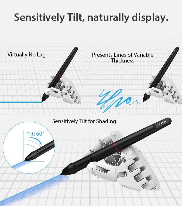 XP-Pen Artist 15,6 Pro поддерживает функцию наклона на 60 градусов, что позволяет легко и быстро ощущать движение жестов стилуса, чтобы обеспечить точную имитацию реального эффекта наклона кисти, обеспечивает плавный и более естественный переход между линиями и штрихами. Вы будете наслаждаться более естественным опытом рисования, чем когда-либо прежде.