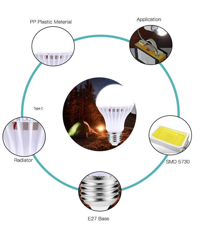Тип цоколя: E27 Напряжение: DC12V/220 В Потребление: 5 Вт/9 Вт/15 Вт Чип SMD: 2835 SMD Цвет света: холодный белый DC12V Светодиодная лампа может использоваться только в DC12V, пожалуйста, не используйте в AC110V-220V. Спасибо.
