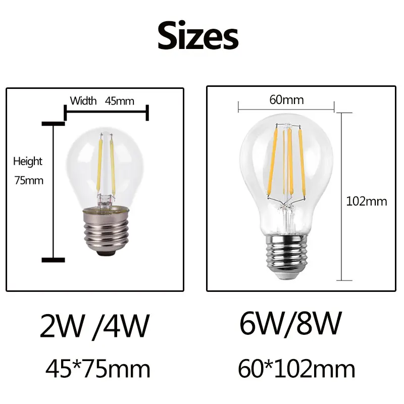 Item Type:Edison led bulb / Led Filament Bulb Base Type: E27 ( A60 ,G45); Voltage: AC 220V , Emitting Color: Warm White,Cold White Wattage: 2W / 4W / 6W / 8W LED Type:COB Material: Glass /Aluminum Color temperature: 2900-3200K(Warm White) 6000-6500K(Cold White) Averange Life: >50,000 Hours Bulb Color: Transparent,Clear Beam Angle: 360 degree Warranty: 1 years