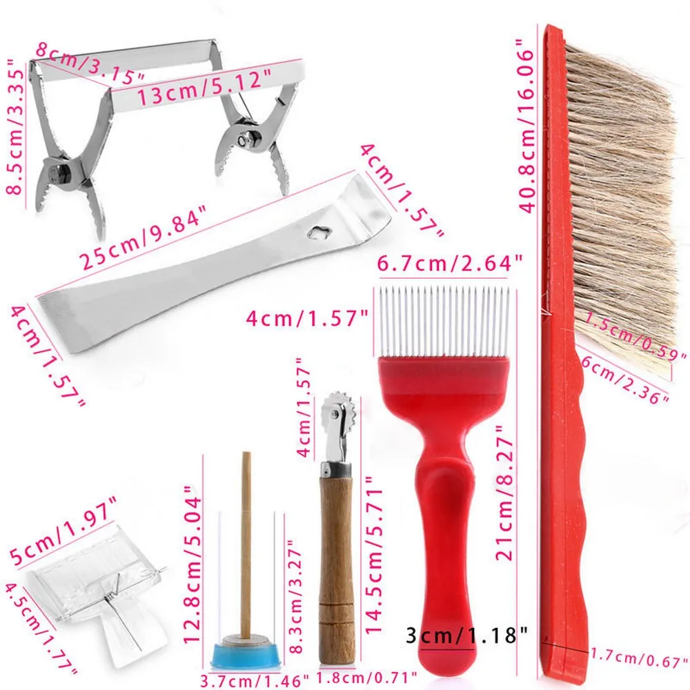 1Pc x Queen Marking Cage With Plunger 1Pc x Bee Brush 1Pc x Uncapping Fork 1Pc x Queen Catcher 1Pc x Hive Frame Holder 1Pc x Spur Wire Wheel Embedder 1Pc x Hive Tool