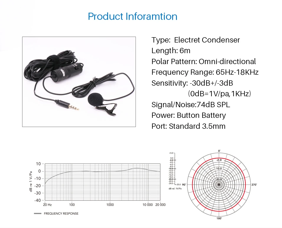 BOYA BY-M1-это всенаправленный петличный микрофон, предназначенный для смартфонов, DSLR, видеокамер, аудиомагнитол, ПК и т. д., он идеально подходит для использования в видео. С рисунком Omni pickup, для полного покрытия на 360 °, это абсолютно дает вам возможность запечатлеть что-либо на своем месте. Кроме того, встроенный 6-метровый (20 ”) кабель с 3,5 мм 4-х полюсной золотистой вилкой-это всего лишь второе должен быть подключен к вашим смартфонам и большинству камер. 100% хороший выбор. Супер звук для презентаций и Видео Аудио recordersBOYA BY-M1 Lavalier Clip-on всенаправленный конденсаторный микрофон предназначен для использования видео и обеспечивает четкое и точное воспроизведение голоса. Дизайн в стиле Newscaster обеспечивает эффективный всенаправленный рисунок пикапа. Это лучшая производительность + доступная стоимость для ваших полных видео потребностей. С помощью микрофона -Для смартфона -Выключите микрофон. Сдвиньте вкл/выкл до выкл/смартфона. -Питание выключено. -Для DSLR, видеокамер, аудиомагнитол, ПК и т. Д. -Включите микрофон. Вкл/Выкл Вкл. Особенности -Клип на микрофон для смартфонов, DSLR, видеокамер, аудио рекордеров, ПК и т. Д. -Всенаправленный конденсаторный микрофон -Высококачественный конденсатор идеально подходит для видеосъемки -Низкий уровень шума обработка -Включает в себя отворот клип, поролоновое ветровое стекло, 1/4 "адаптер Технические характеристики -Тип преобразователя: электретный конденсатор -Полярный узор: всенаправленный -Частотный диапазон: 65 Гц ~ 18 кГц -Сигнал/шум: 74 дБ SPL -Чувствительность: -30 дБ +/-3 дБ/0 дБ = 1 В/па, 1 кГц -Выходное сопротивление: 1000 Ом или меньше -Выход подключение: 3,5 мм (1/8¡±) 4-х полюсной золотистой вилкой -Тип батареи: LR44 (в комплекте) -Циклическая запись: 0,7x0,3x0,3 дюймов (18,00x8,30x8,30 мм) -Аудиокабель: 20ft (6,00 м)