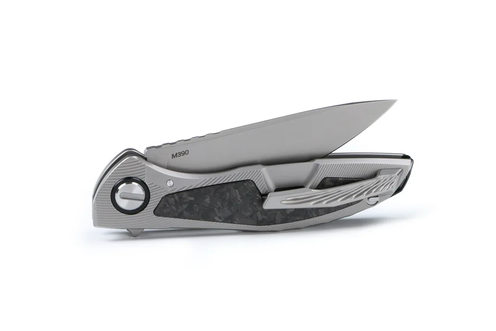 Специальный выпуск NeOn CD NL M390 (только 100 производства в Китае), проект был закрыт. Все ножи входят в частную коллекцию. Ручка из углеродного волокна с дымовым элементом (выглядит эффектно) Топ blade-M390 сталь Материал ручки-CF (углеродное волокно/титановый сплав) Тип: титановая подкладка (вставка из инкрустированной стали) Общая длина: 195 мм (7,67 дюйма) Длина лезвия: 85 мм (3,34 дюйма) Толщина лезвия: 3,5 мм (0,157 ") Ширина лезвия: 24 мм (самая широкая) (0,94 дюйма) Длина ручки: 110 мм (4,33 ") Обработка поверхности лезвия: Мойка мелким камнем Подшипник: керамический подшипник стальной рамы Интервал: титановый сплав Карманный зажим: титановый сплав Твердость: HRC 60 ± Вес нетто: ≤ 94 грамма Материал лезвия: австрийская Порошковая сталь M390 Хранение: нейлоновая сумка на молнии