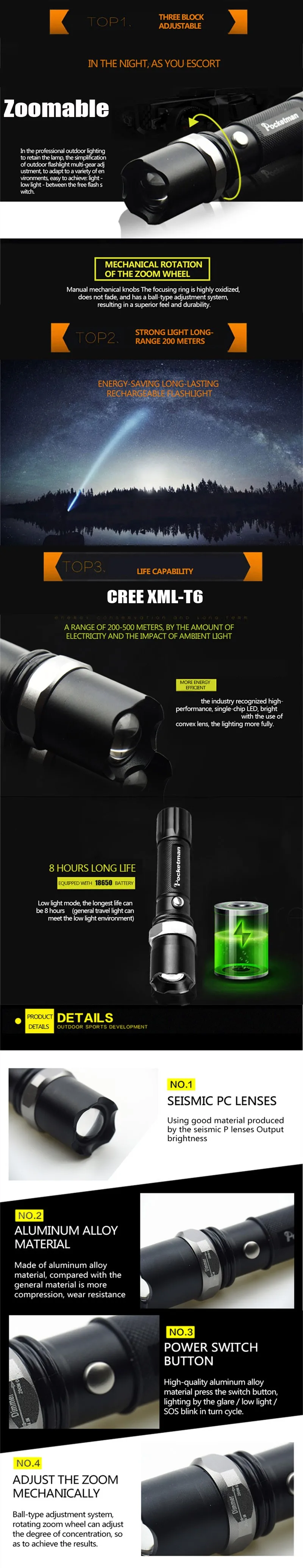 1. Название бренда: Pocketman 2. Название модели: FT17 3. Количество: 1 шт. 4. Светодиодный излучатель: XM-L T6 5. Режим: 5-Mode (High - Medium - Low - Sos - Strobe) 6. Срок службы лампы: 100000 часов 7. Цвет: черный 8. Излучаемый Цвет: белый светильник 9. Переключатель: Центральный переключатель 10. Линзы: выпуклая линза 11. Материал корпуса: прочный авиационный алюминий 12. Батарея: 1x18650/3 x AAA Подходит для: кемпинга, пеших прогулок, альпинизма, охоты, рыбалки, авто чрезвычайных ситуаций и ремонта дома.