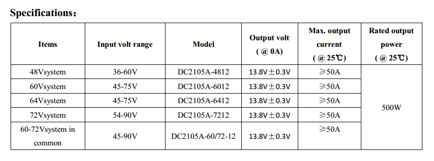 Входное напряжение: 48 В/60 в/64 в/72 В/80 В/84 в/96 в/108 в/120 В/144 в Выходное напряжение: 13,8 В; Номинальная выходная мощность: 500 Вт @ 25 ℃; Пиковая выходная мощность: 600 Вт @ 25 ℃ 6 мин; Макс. Выходной ток: ≥ 50A @ 25 ℃ (модуль выходного напряжения 13,8 В); Максимальная эффективность: ≥ 85% (типичное значение 88%). (2) Детали безопасности: Вход изолирован с выходом полностью; Значение сопротивления изоляции между входом и выходом и shell≥ 50MΩ @ 25 ℃; Выдерживает испытание 1000Vdc между входом и выходом и оболочкой в течение 1 мин. ток протекает ≤ 5 мА. (3) условия требования части: Диапазон рабочих температур: -20 ℃-+ 60 ℃; Диапазон температур установки: -30 ℃-+ 70 ℃; Степень защиты: IP67;