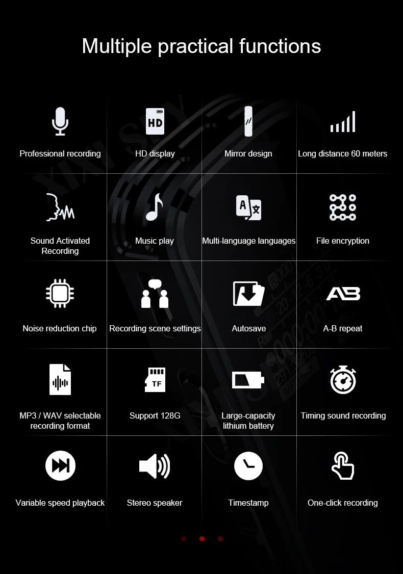 Для профессиональных студий звукозаписи Hd-дисплей Зеркальная конструкция Междугородние 60 метров Звуковая активация Запись Воспроизведение музыки Поддержка множества языков Шифрование файлов Шум чип для снижения уровня Запись настроек сцены Автосохранения A-B повторить MP3 / WAV выбирается формат записи Поддержка 128 г Большой емкости литиевая батарея Время записи звука Переменная скорость воспроизведения Стерео динамик Отметка времени Запись в одно нажатие