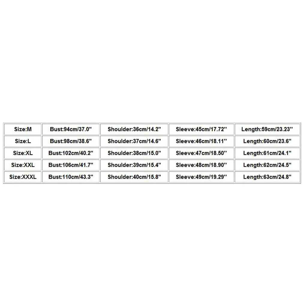 Размер Бюст Плечо Рукав Длина М 94 см/37,0" 36 см/14,2" 45 см/17,72'' 59 см/23,23'' L 98 см/38,6" 37 см/14,6" 46 см/18,11'' 60 см/23,6" XL 102 см/40,2" 38 см/15,0" 47 см/18,50'' 61 см/24,1" XXL 106 см/41,7" 39 см/15,4 дюйма 48 см/18,90'' 62 см/24,5 дюйма XXXL 110 см/43,3" 40 см/15,8" 49 см/19,29'' 63 см/24,8"
