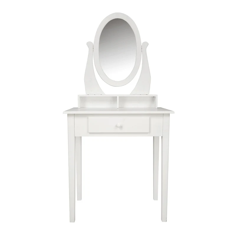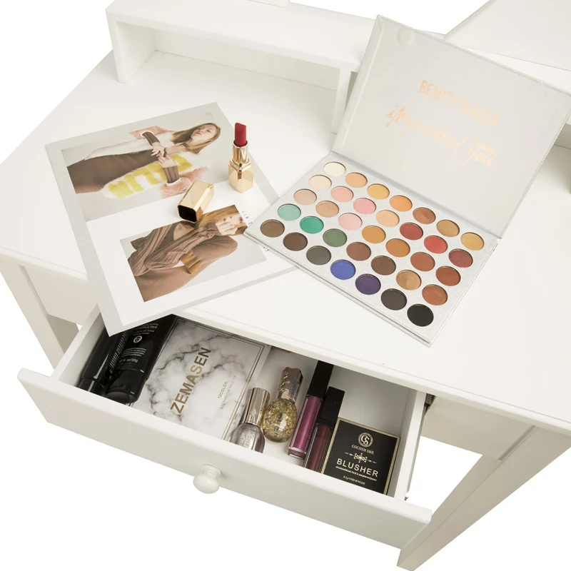 1. Просторная столешница предлагает достаточно места для отображения косметики, ювелирных изделий или декоративных вещей. Три ящика с маленькой круглой умственной ручкой легко вытягиваются или вставляются и обеспечивают достаточно места для классификации ювелирных изделий. Полка на двух верхних ящиках также может использоваться для демонстрации или хранения ваших вещей.