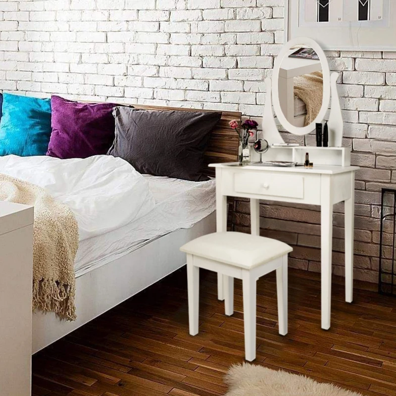 3. Весь дизайн этого туалетного столика элегантный и чистый. Простота делает вас свежим и естественным и соответствует любому украшению вашей комнаты или дома. Изогнутые ножки добавляют полимерный фактор и придают прочную поддержку столу и стулу.