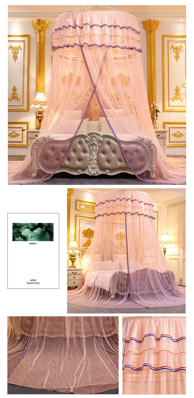 Подходит для кроватей 1,2-2 м Размер: Диаметр верхнего кольца: 1,2 м Нижний Периметр: 12 м Общая высота: 2,7 м Примечание: 1. В том числе пластиковый стальной проволочный кронштейн, двухслойная присоска, может вращаться в любом направлении. 2. Возможны отклонения в 1-3 мм из-за ручного измерения. 3. Из-за различных дисплеев и другого светильник, изображение может не отражать фактический цвет товара. Спасибо за понимание.