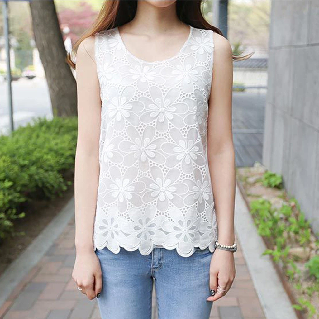 Особенности: Повседневный; без рукавов; круглый вырез; кружевные топы с цветочным рисунком; женские топы; сезон осень-весна.