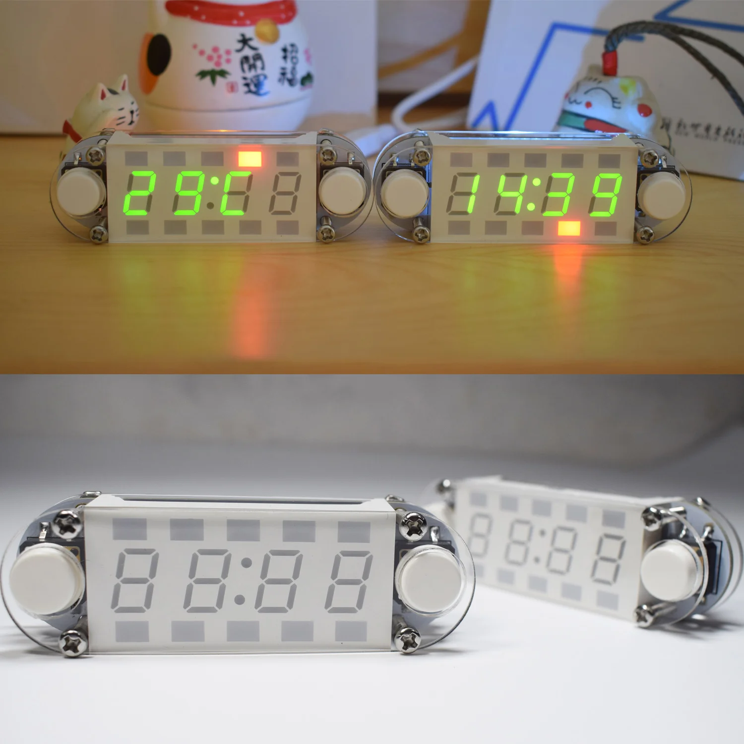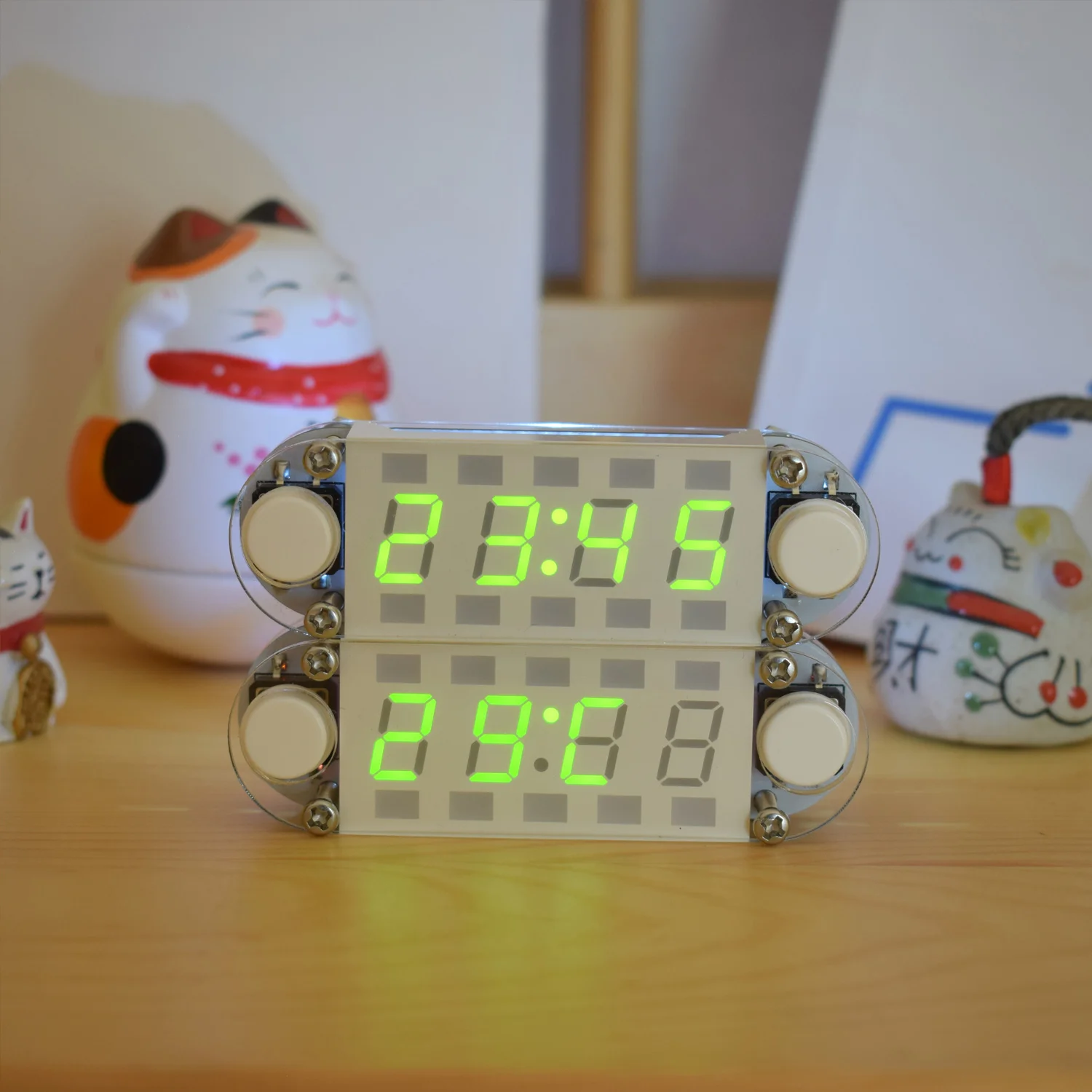 Идеальный набор для начинающих для любого студента STEM, чтобы работать практически. В этом наборе часов DIY используются специальные белые цифровые трубки для чтения и зеленого цвета. Красный светодиодный квадрат может использоваться в качестве секундного перемещения. Зеленая цифровая деталь отображает время, температуру, дату и день недели. В то же время, есть три дополнительных цвета желтого, синего или белого для эффекта подсветки и мигающих подсказок на внутренней и задней стороне, и встроены несколько эффектов подсветки. Более того, цифровая трубка имеет различные эффекты переключения анимации на выбор, а также более десятка функций, таких как будильник, автоматическая регулировка яркости, сигнал времени, часовая анимация, обратный отсчет и секундомер, так что простые часы DIY больше не будут скучными.