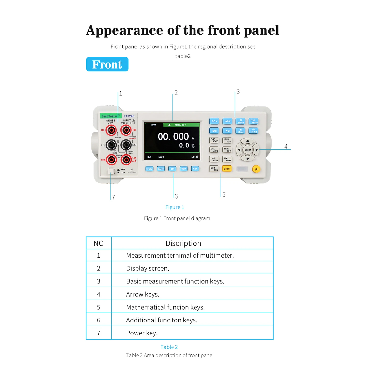 ET3240-это 4 цифры, 22000 отсчетов, двойной цифровой настольный мультиметр true-RMS. Чип STM32 и внешняя двойная Интегральная реклама, используемые этим настольным мультиметром, обеспечивают точное измерение и стабильную производительность. 3,5 дюймов 320*480 с высоким разрешением на тонкопленочных транзисторах на тонкоплёночных транзисторах ЖК-дисплей экрана делает четкого восприятия информации, богатого дисплея, а также отлично визуальные эффекты. Настольный мультиметр питается от электричества и обеспечивает полную защиту от перегрузки. Свежий и простой дизайн с отличной производительностью делает их идеальным выбором для электриков, энтузиастов электроники, инженеров и колледжей и вузов.