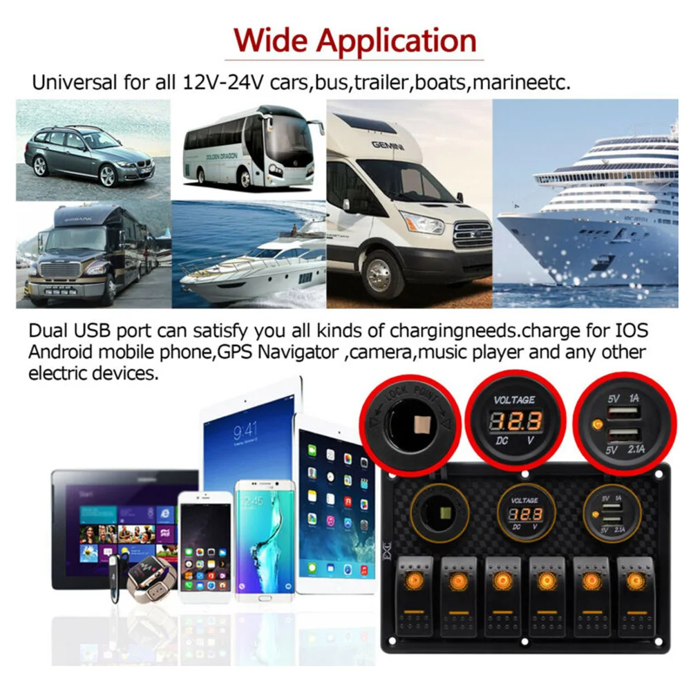 * Панель переключателей для управления общим электрическим оборудованием транспортных средств: фары, противотуманные фары, лампы шириной, переключатели для автомобильного холодильника, автомобильные вакуумные выключатели, внешнее оборудование для автомобиля и т. Д.