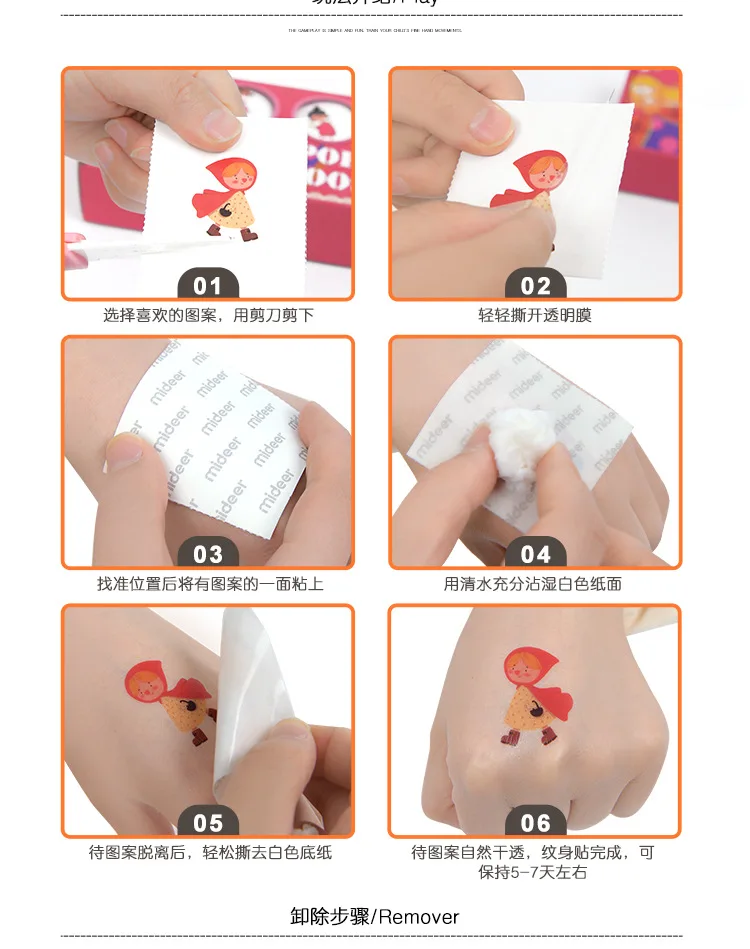 -Татуировки безопасны для ваших детей. Татуировки легко снимаются с помощью детского масла, средства для снятия макияжа или спирта.