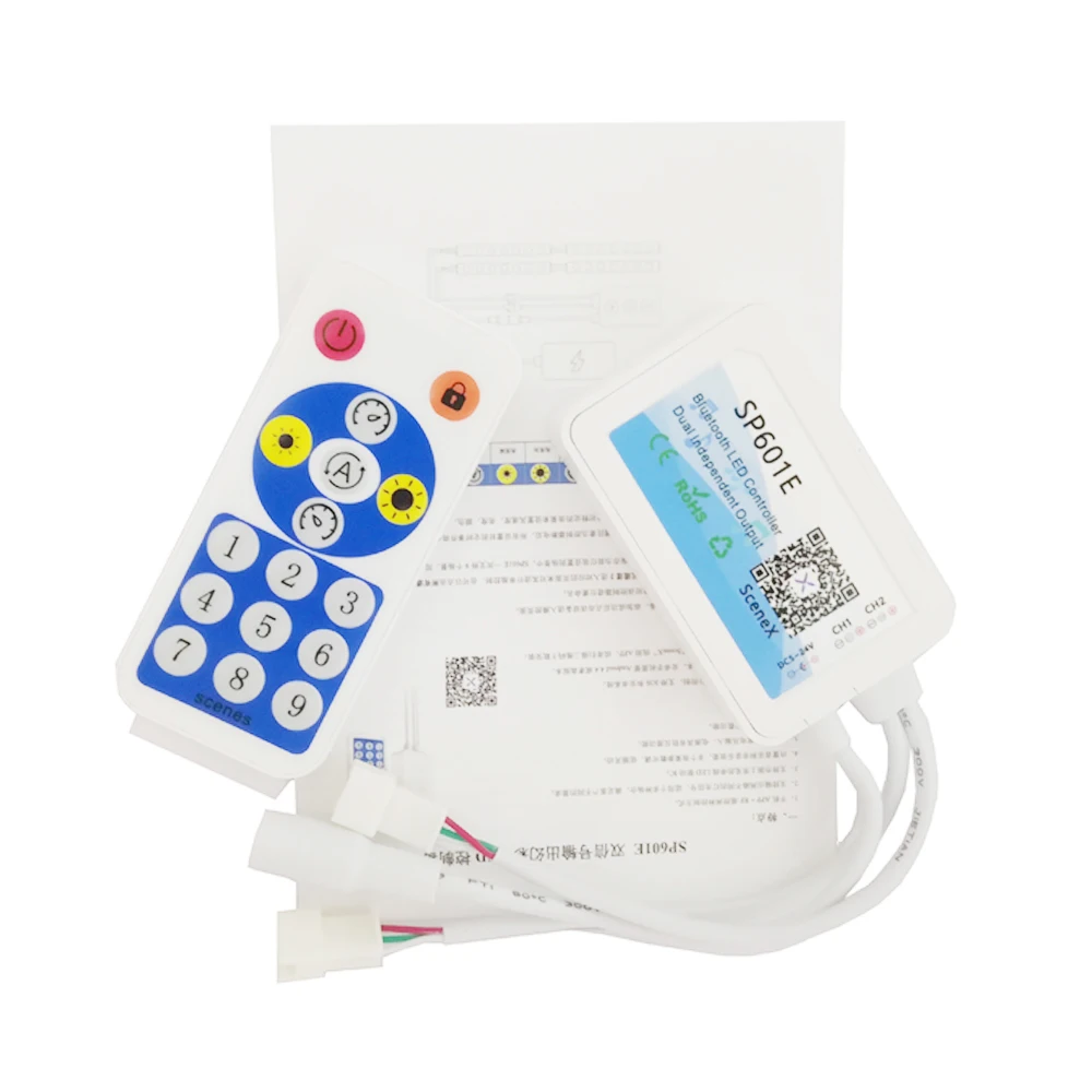 1. Особенности: 1. Поддерживает как Управление приложениями, так и дистанционное управление RF; 2. Двойной выход двух различных сигналов, подходит для различных приложений и удовлетворения различных потребностей клиентов; 3. Поддерживает обычный светодиодный драйвер на рынке; 4. Встроенные музыкальные и немузыкальные эффекты, мульти-параметры регулируются; 5. DC5 ~ 24 В широкий вход напряжения, с функцией анти-обратного подключения источника питания; 6. С функцией автоматического сохранения параметров настройки. 2. Функции приложения: SP601E поддерживает управление через приложение, поддерживает IOS и систему Android. Для устройств Apple требуется IOS 10,0 или более поздняя версия, для устройств Android требуется Android 4,4 или более поздняя версия, Вы можете искать «SceneX» в App Store или Google Play, чтобы найти приложение, Или отсканируйте qr-код для загрузки и установки: Приложение операции: • Откройте приложение и нажмите кнопку в правом верхнем углу главной страницы, чтобы добавить устройство, а затем нажмите устройство, чтобы получить доступ к странице управления. • Вы можете переименовать контроллер, нажав на кнопку в правом верхнем углу. • SP601E может выводить два различных сигнала, вы можете нажать на канал 1 или канал 2, чтобы войти на соответствующую страницу, чтобы контролировать его индивидуально, или вы можете нажать на все каналы, чтобы контролировать оба канала в едином порядке. • После настройки эффекта каждого канала нажмите кнопку в правом верхнем углу, чтобы сохранить текущие настройки эффекта освещения на сценах, SP601E поддерживает в общей сложности 9 сцен, пользователи могут позвонить в эти 9 сцен через страницу сцены мобильного приложения или использовать пульт дистанционного управления RF. • Пользователи могут настроить до пяти событий синхронизации, нажав на кнопку в правом верхнем углу, обратите внимание, что все установленные события синхронизации будут удалены, когда контроллер выключен. • На странице эффектов представлены различные музыкальные эффекты и немузыкальные эффекты, пользователи могут устанавливать скорость, яркость, цвет, направление и длину эффекта для определенного эффекта.