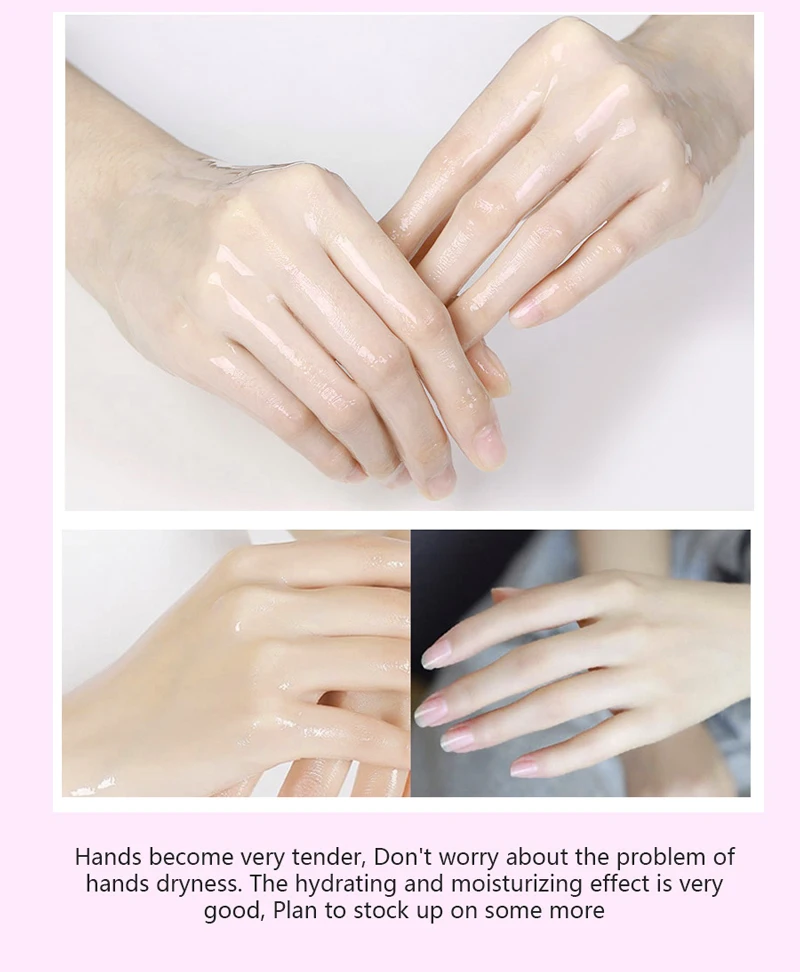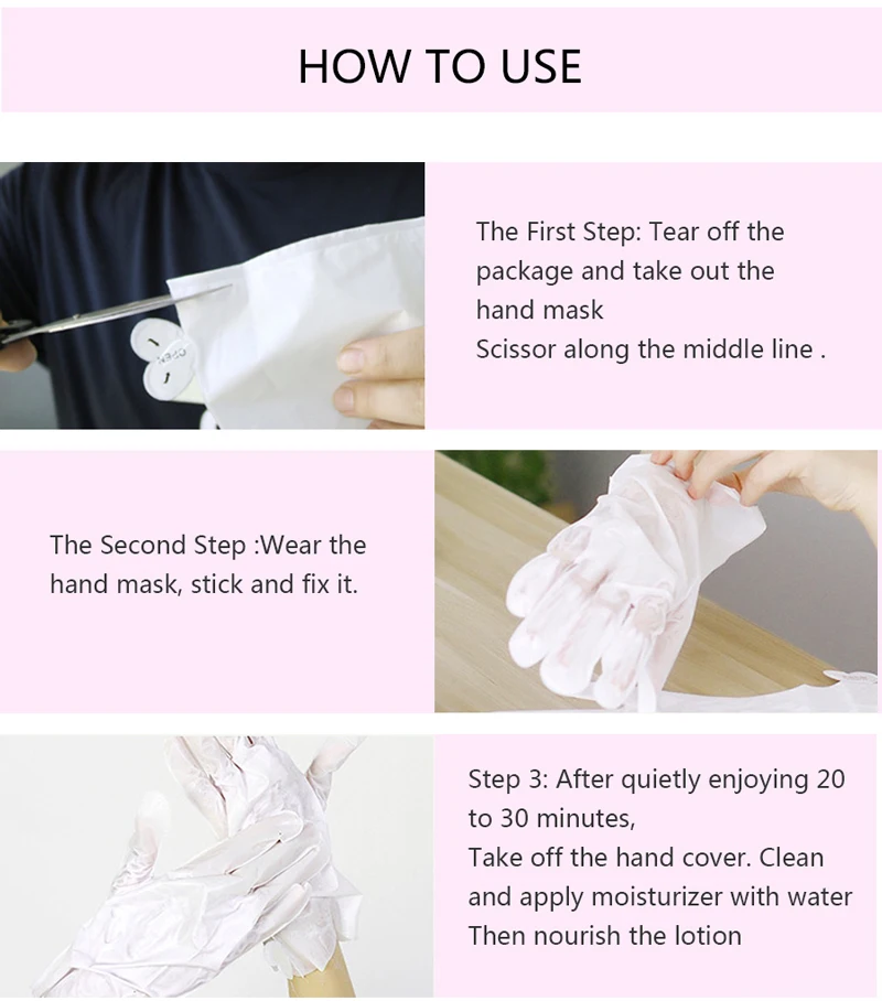 Очистите руки и высушите их, затем Наденьте маску для рук, чтобы руки полностью прикрепились к пленке. Нанесите на 20-40 минут и массируйте руками во время использования. Удалите маску для рук, аккуратно массируйте до впитывания, затем удалите краску водой.