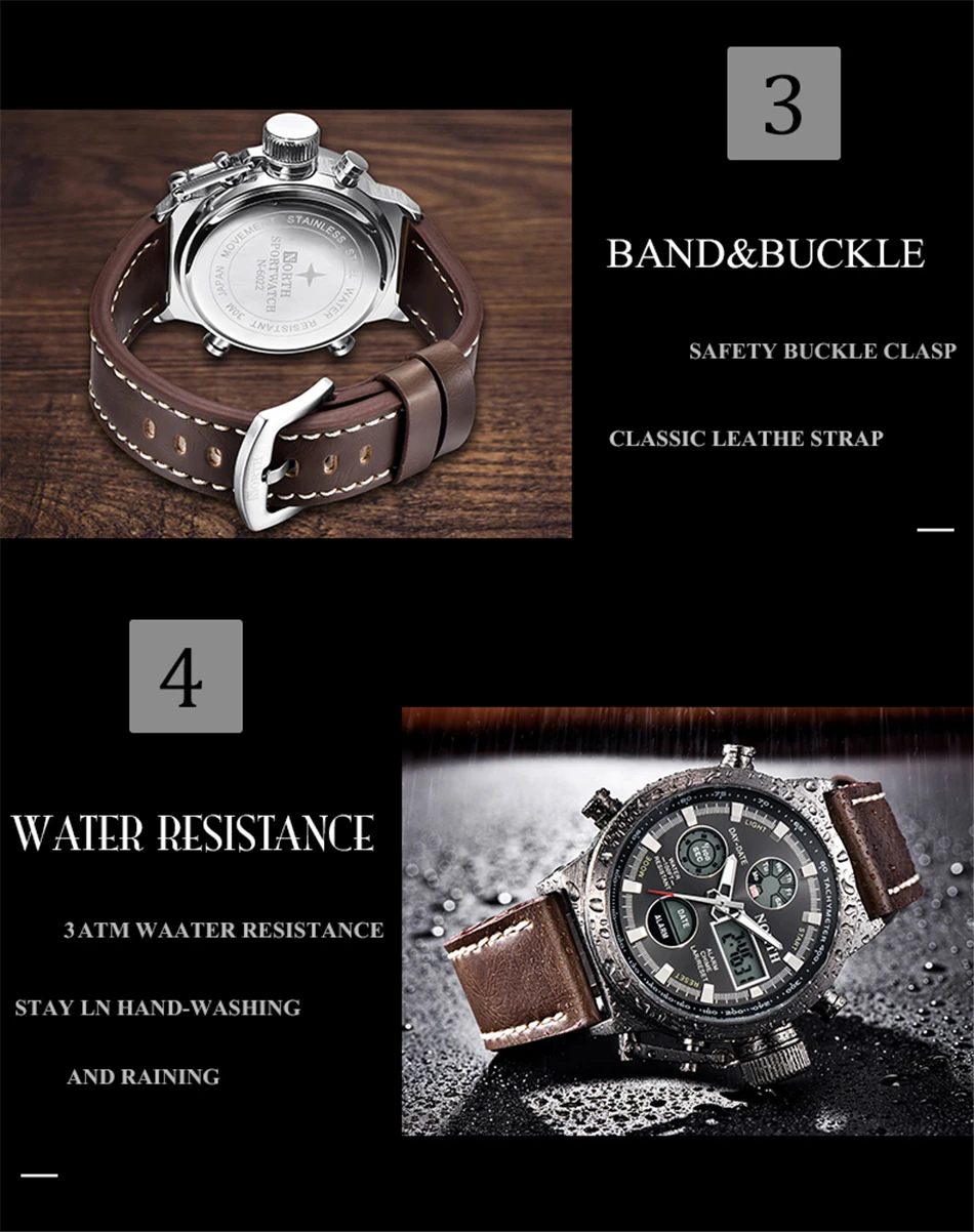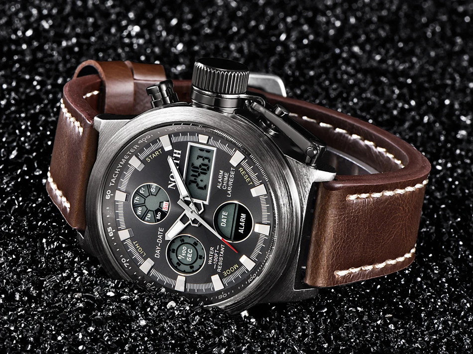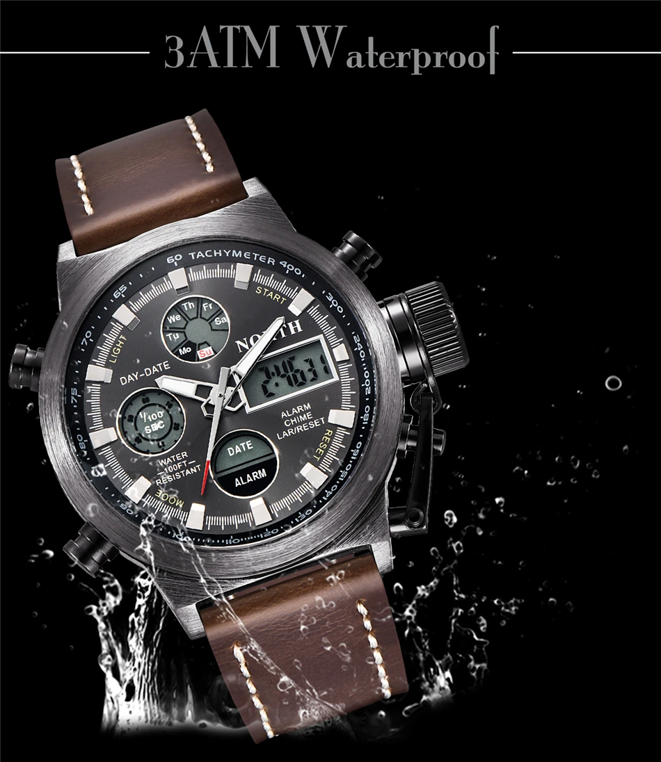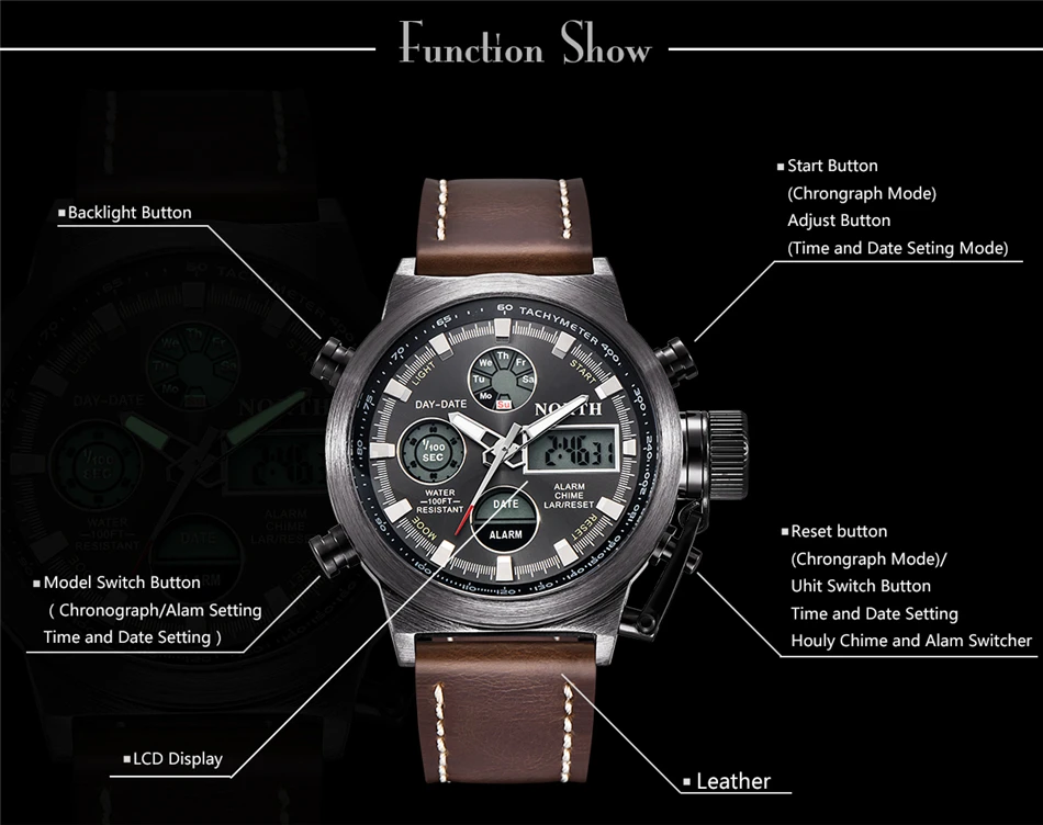Описание 100% новые и высококачественные Сигнал тревоги с 4 мин., Повтор сигнала Отображение дня, даты и времени Chrime на каждый час Хронограф с работой на 1/100 круга Двухъядерный Аналоговый и цифровой дисплей Функция EL (синий) Функция ежечасного звонка Кожаный ремешок Водостойкий Характеристики Материал корпуса: сплав Диаметр корпуса: 44 мм Толщина корпуса: 16 мм Материал ремешка: кожа Длина ремешка (включая чехол): 250 мм Ширина ремешка: 22 мм Вес: 96 г Что входит 1x100 Новый Север 1 аналоговый и цифровой дисплей с будильником и синими часами с функцией EL