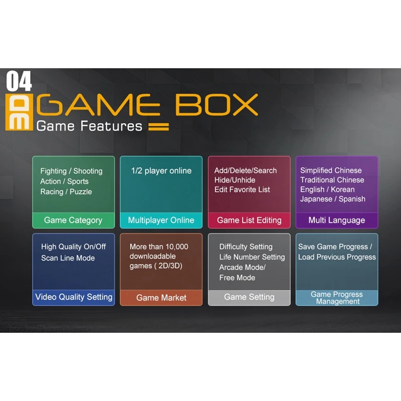 Поддержка различных эмуляторов игр: FC,SFC, GB, GBA, GBC, MD, PCE, WSC, N64, PS, FBA, MAME, PPSPP и DC, почти полное покрытие эмулятора игр;