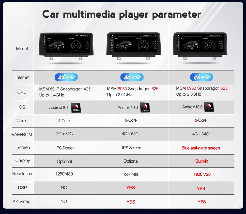 Специальная функция> 3 варианта версии системы:1.MSM8917: 2 Гб ОЗУ + 32 Гб ПЗУ>MSM8917(Snapdragon 425) четырехъядерный Cortex-A53 до 1,4 ГГц> Разрешение 1280*4802.MSM8953: 4 Гб ОЗУ + 64 Гб ПЗУ> MSM8953 (Snapdragon 625) Восьмиядерный Cortex-A53 до 2,0 ГГц> CPU встроенный шестигранный 546 DSP качество звука еще больше Улучшено> Разрешение 1280*4803.MSM8953:4 Гб ОЗУ + 64 Гб ПЗУ> MSM8953 (Snapdragon 625) Восьмиядерный Cortex-A53 до 2,0 ГГц> CPU встроенный шестигранный 546 DSP качество звука еще больше Улучшено> 1920*720 разрешение,Синий антибликовый экран> Встроенный carplay> Специальная функция1, он может поддерживать управление рулем и кнопку Idrive2, поддержка оригинального дисплея информации о автомобиле2, поддержка 1080P Поддержка музыки без потерь3, поддержка камеры, встроенный микрофон4, поддержка Bluetooth hands-free operation5, поддержка Google Maps онлайн навигация7, поддержка онлайн видео, кино, музыки, радио, Youtube, Yahoo, MSN...> Дополнительная функция1, поддержка автомобильного видеорегистратора, USB камеры (с ADAS)2, поддержка автомобильных TPMS3, поддержка carplay4. Поддержка DAB +![]()