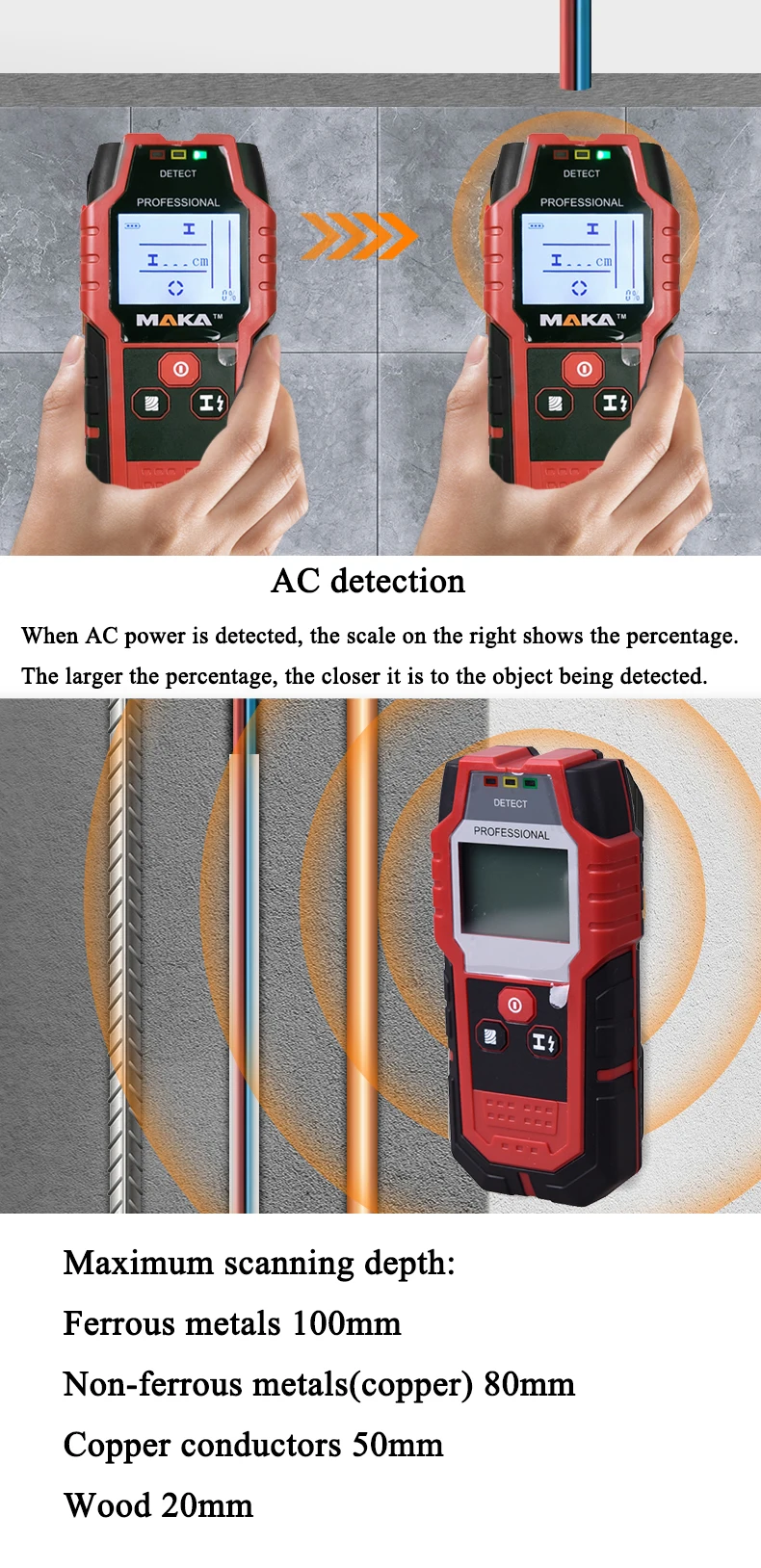 Детектор может обнаруживать металл (стальной стержень, медные трубы) и кабели, спрятанные в стенах, потолках и полах. Он также может обнаруживать деревянные балки, металлы и кабели, скрытые под гипсокартоном.