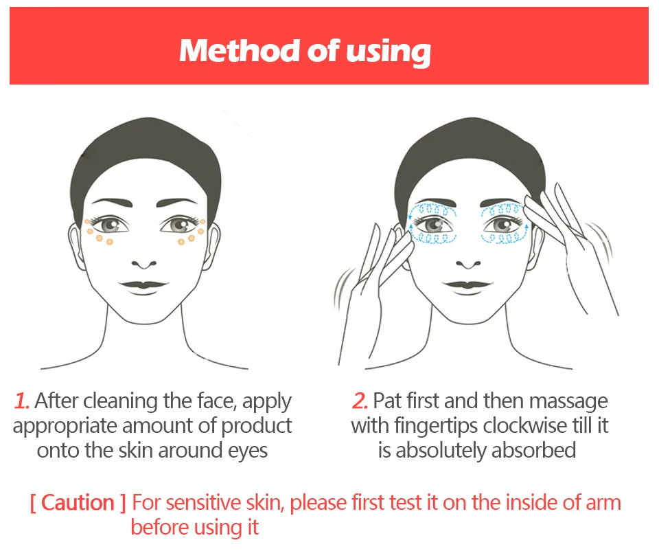 1. После очистки лица, нанесите необходимое количество продукта на кожу вокруг глаз 2. Погладьте сначала, а затем массируйте кончиками пальцев по часовой стрелке, пока она не будет полностью поглощена [Внимание] для чувствительной кожи, пожалуйста, сначала проверьте ее на внутренней стороне руки, прежде чем использовать