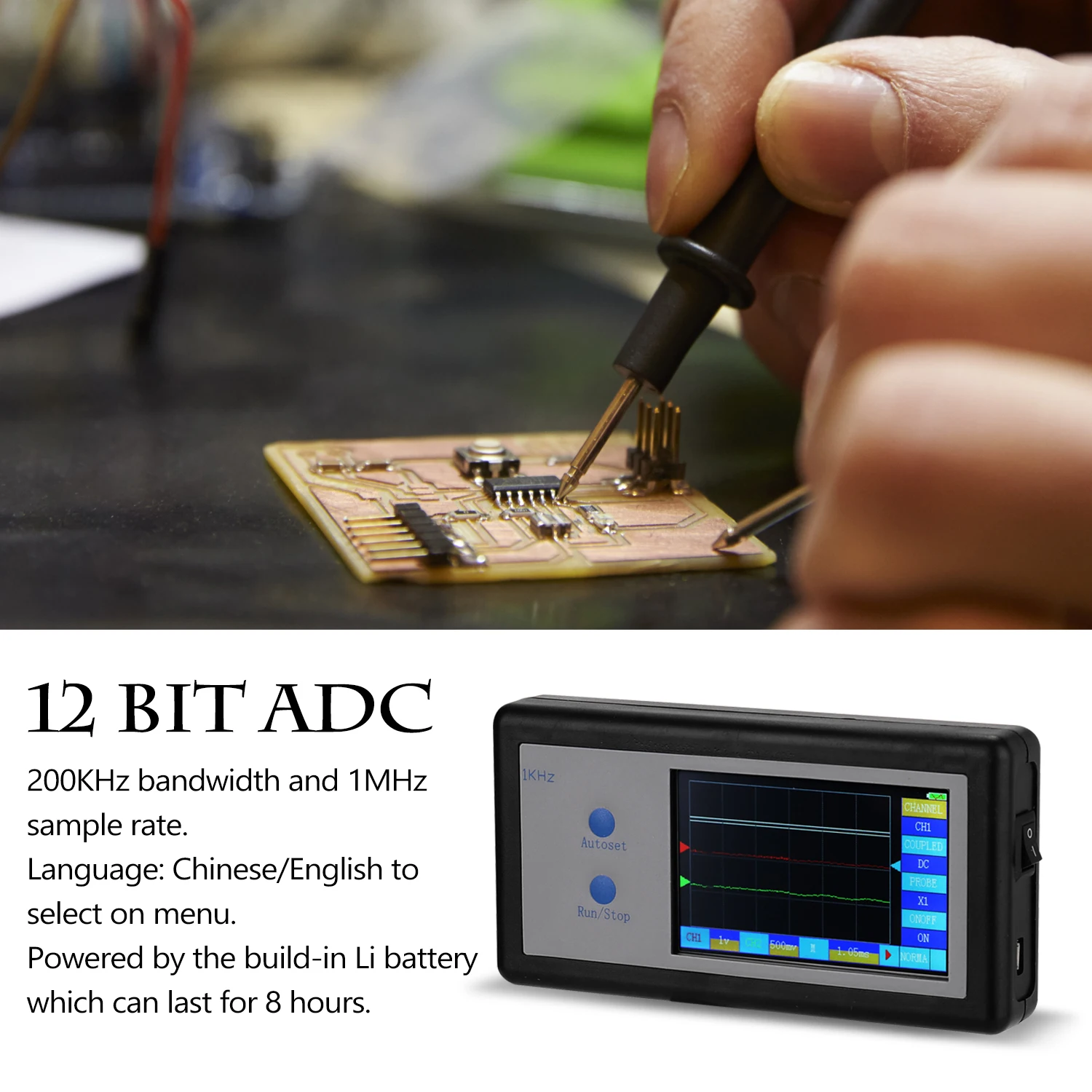 Это экономичный и практичный осциллограф начального уровня с пропускной способностью 200 кГц и частотой дискретизации 1 МГц, который в основном может удовлетворить потребности работников общей электроники.
