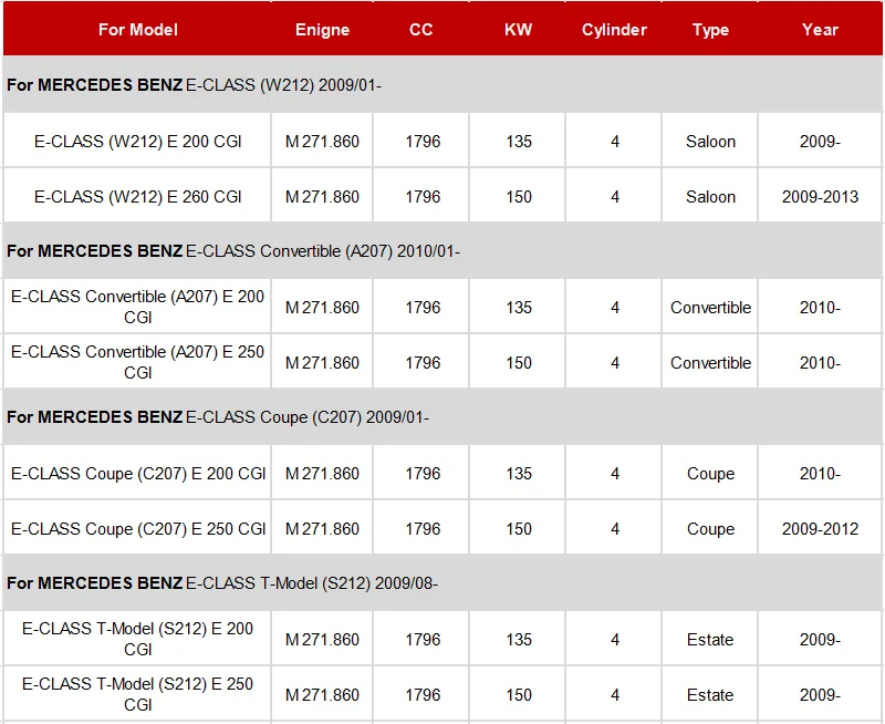 Для MERCEDES BENZ E-CLASS Coupe (C207) E 250 CGI Coupe 2009-2012