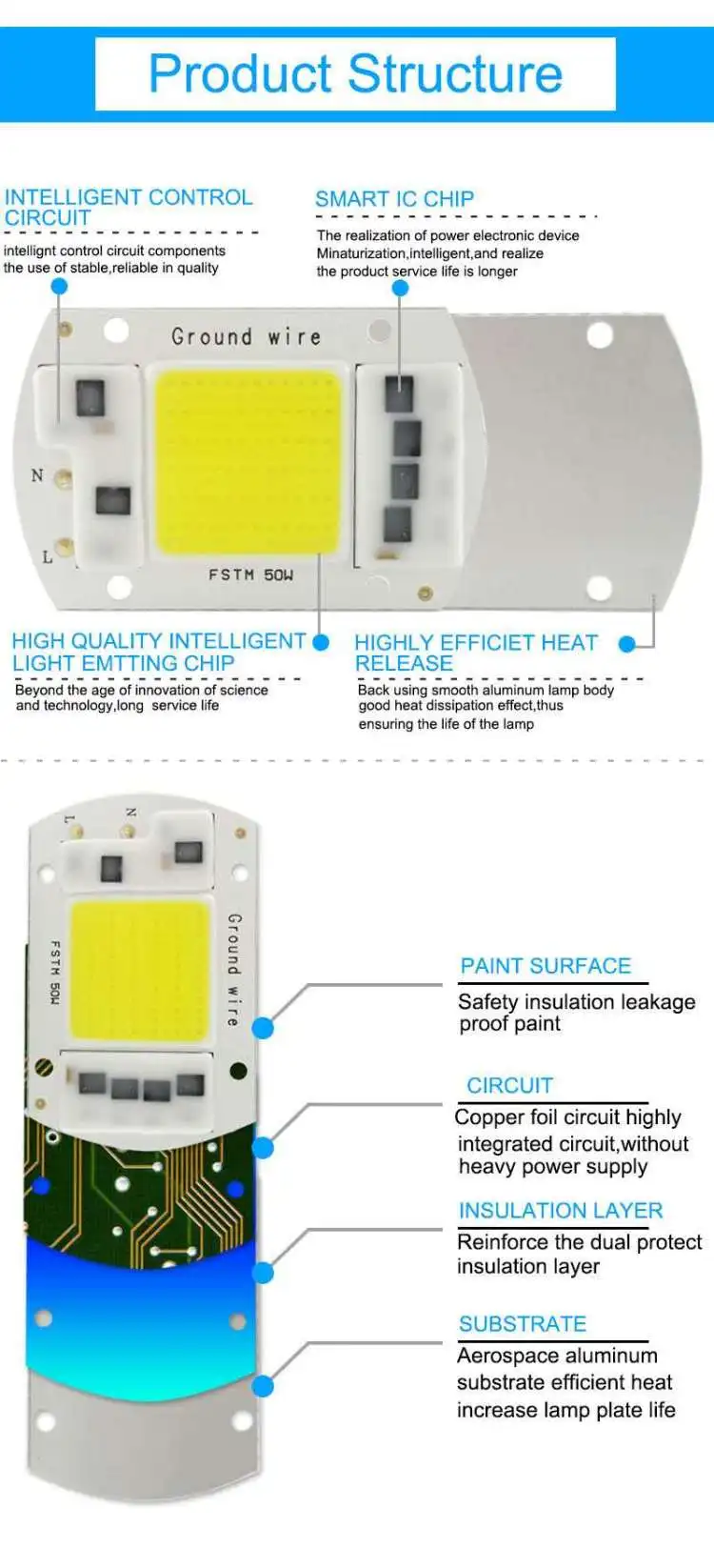 Спецификация: 1. ВАТТ: 15 Вт/20 Вт/30 Вт/50 Вт 2. Напряжение: 220-240 В; 110 В 3. Цветовая температура: холодный белый 6000- 6500K; Теплый белый 2800-3200K; Дневной белый 4000-4500K 4. Угол луча: 120 градусов 5. Характеристики: Нет необходимости в драйвере; Умный IC; Легко DIY 6. Как использовать: Подключение 220-240 В; 110 В 7. Срок службы: более 10 000 часов 8. Материал корпуса: алюминий