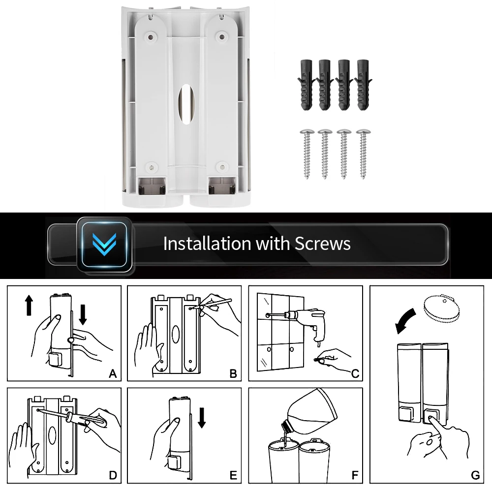 Оснащен двухсторонними пенными лентами и винтами без гвоздей для крепления дозатора на плиточную стену без какого-либо сверления на стену, или установите его на стену с помощью предоставленных винтов и шлангов.