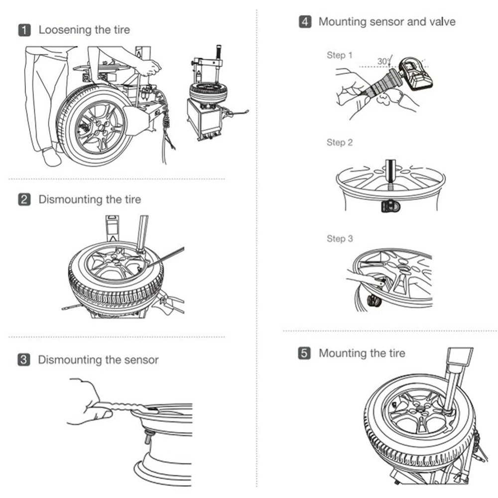 1. Ослабьте шину: Снимите колпачок клапана и сердечник и сдуйте шину. 2. Демонтаж шины: Закрепите шину на смене шин и отрегулируйте клапан на 1 часе относительно разделительной головки шины. Вставьте инструмент для шин и поднимите шарик для шин на монтажную головку, чтобы скидка на головку. 3. Демонтаж датчика: с помощью отвертки снимите крепежный винт и датчик с штока клапана, затем ослабьте гайку и снимите клапан. 4. Датчик крепления и клапан: пропустите стержень клапана через отверстие клапана обода. Затяните винт-гайка с 4,0 нм с помощью штифта. Соберите Корпус датчика против обода и затяните винт. 5. Крепление шины: Поместите шину на обод, убедившись, что клапан находится на разделительной головке под углом 180 градусов. Установите шину над ободом.