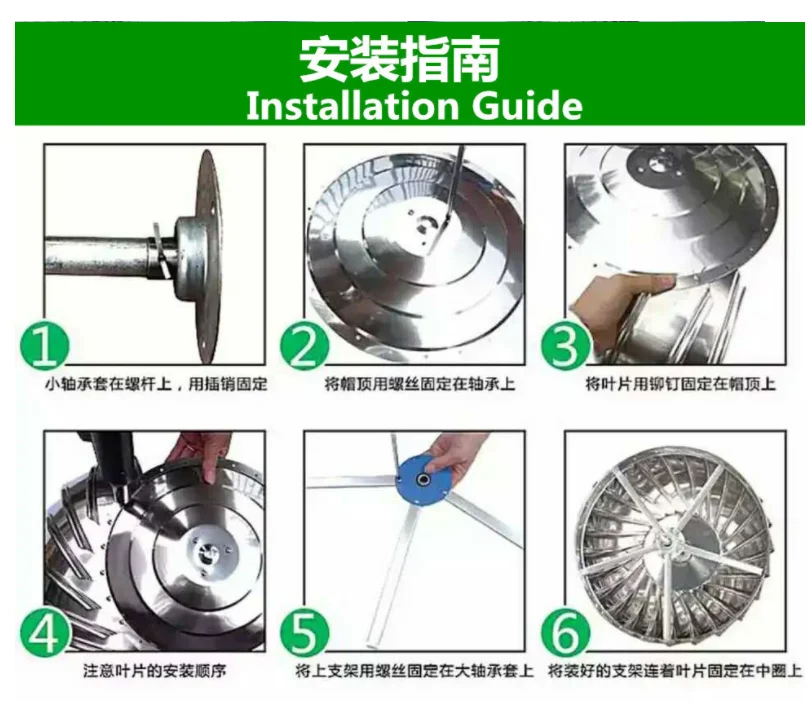 Дуговые лопасти могут достичь оптимального вытяжного эффекта, который научно рассчитан, при условии, что дождевая вода не попадет на работающий вентилятор. Центральная ось с частым интервалом, благодаря чему лопасти никогда не деформируются при высокоскоростной работе, тем самым значительно увеличивая срок службы Установка очень простая, как правило, требует всего 30 минут Турбинные лопасти способны нормально функционировать в течение 15 лет Примечание: Вентилятор должен быть установлен на горизонтальной плоскости и не может быть использован на наклонных поверхностях. Наклонная установка повлияет на вращение